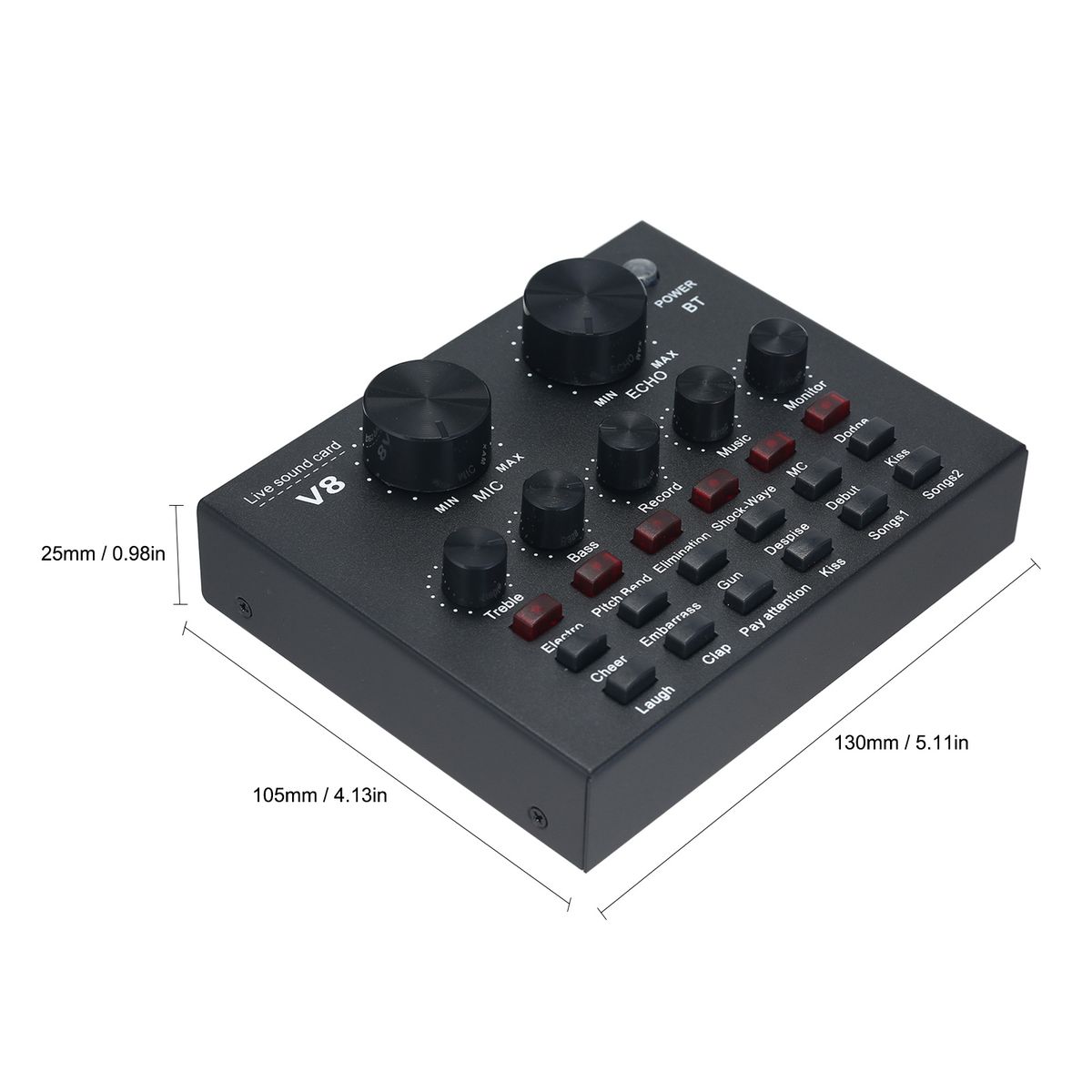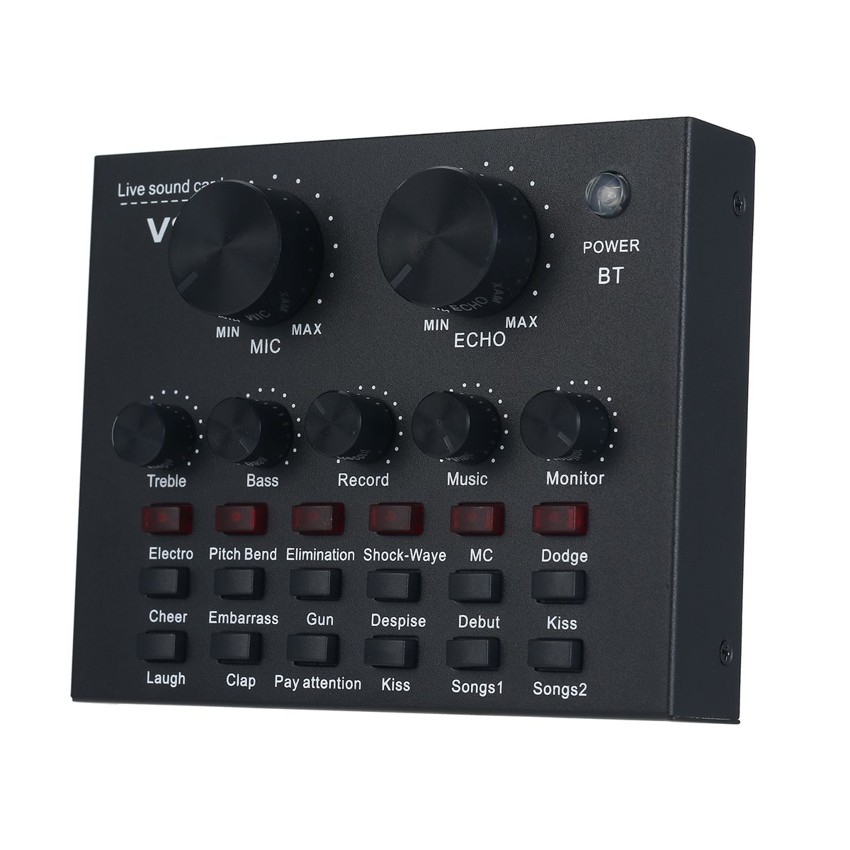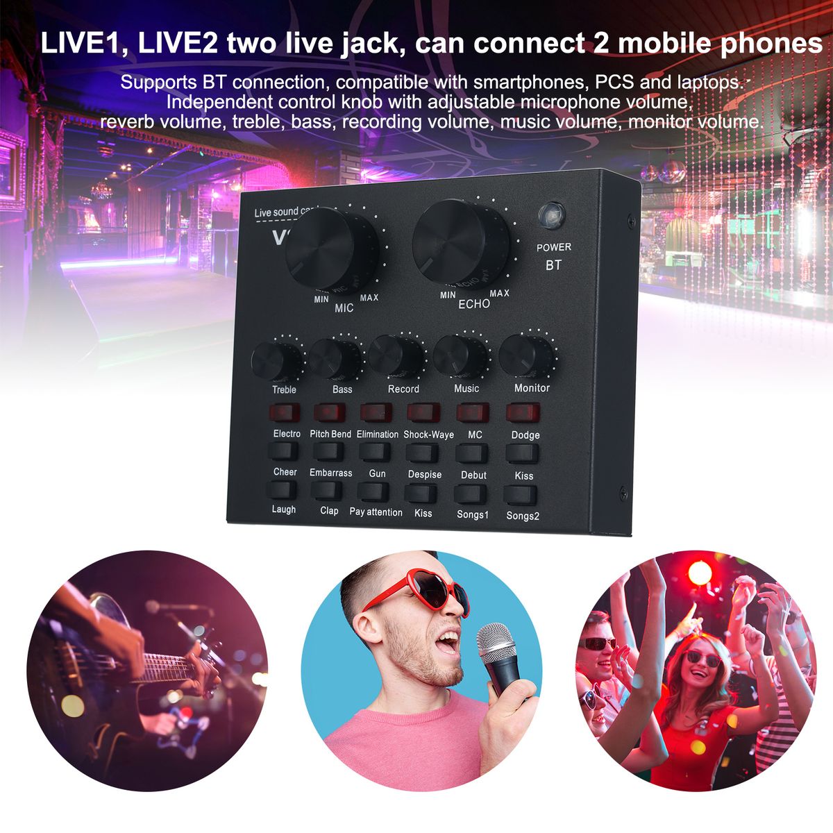The multi-functional live sound card has 12 kinds of electronic sounds and 12 kinds of sound effects, which supports dual mobilephone use.