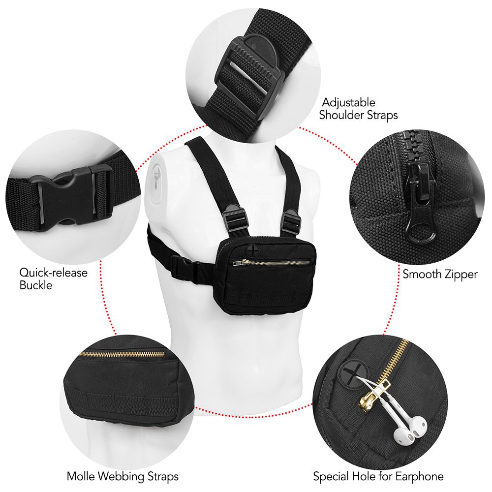 This chest rig bag includes a spacious main compartment and a zippered front pocket to keep your items organized. It features an earphone hole to allow you to enjoy music while running, cycling, or doing other outdoor sports. The straps are adjustable to fit different people, great gift for outdoor enthusiasts.