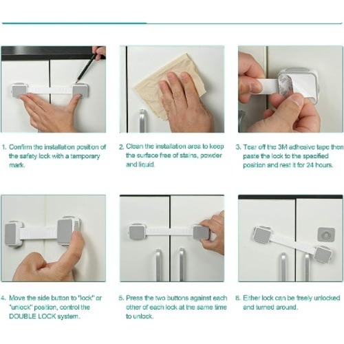SUPER EASY TO INSTALL: No drills or tools needed. Easily install the baby proof cabinet locks with strong adhesive tapes. Simply peel off the cover of the adhesive and stick the baby safety lock on the surface you want to child proof.