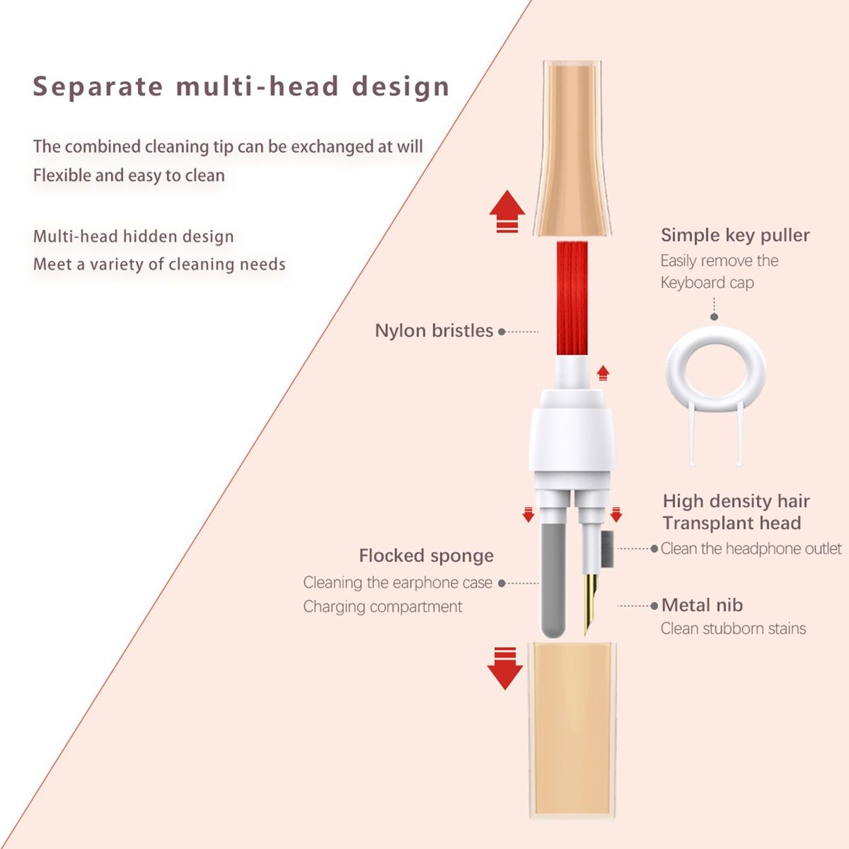 4 in 1: Multifunctional combo cleaning pen with soft brush, key puller, meet various cleaning needs. The pen heads are detachable and can be changed at will, convenient to clean. 3 Heads: Includes nylon bristles, flocking sponges heads, metal nibs, efficiently cleaned dust and stubborn stains in the aperture.Material: Made of high quality ABS, metal and nylon material, strong and durable.Application: Suitable for cleaning Bluetooth headphones, headphone charging boxes, keyboards, mobile phones, tablets, and etc.Portable: Small size, easy to carry on the go. A nice gift for your family and friends.