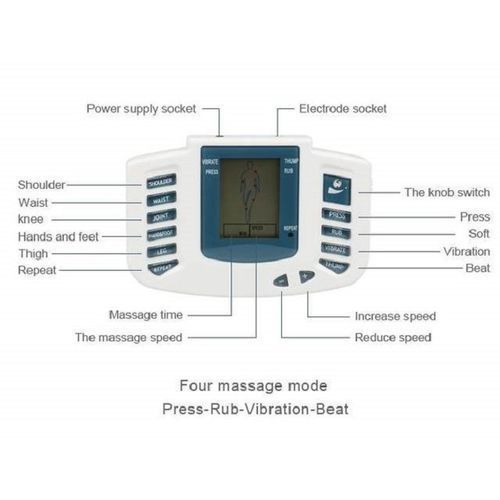 You can choose any of the treatment modes (shoulder/waist/joint button/foot). The product is specially designed for lessening pain in muscles, The apparatus can produce curative effect particularly to the patients suffering from the pain in neck, back, loin and various joints. The exclusively designed program consists of different waves through alternative composition, giving a feeling of manual massage by hand. The soft and gentle pulse can improve the blood circulation and promote main and collateral channels unblocked and give a special effect on releasing fatigue. Use kw305 pulse massage for stiffness of shoulders. Paralysis of peripheral nerves. Recovery of fatigue. Improves blood circulation neuralgia. Gradual release of muscular pain. Preparing & setting the electrodes 1. Correctly connect the electrode cord to the electrode pads or magnetism shoes. 2. Insert the plug of the electrode cord into the unit electrode jack. 3. Pull off the film from the electrode pads. 4. Use a damp towel to wipe the area of skin on which you will be affixing the pads to remove any oil, cosmetic or dirt. 5. Should the electrode pads be soiled, both their adhesiveness and the number of times of possible use will be reduced. 6. Apply the electrode pads to the area of the body you wish to massage. The unit can`t operate unless both pads from at lease on change are applied. Button description total 13 buttons 1. "Shoulder" button: suit for massage on shoulder and back. Press speed "+"/ "-" button to adjust the intensity. And speed is automatically reduced or increased. It takes 30 minutes (Press->Rub->Vibrate->Thump) 2. "Waist" button: designed for waist massage. Waist massage state will be shown on screen. And change mode per 5 minutes(Press->Rub->Vibrate->Thump), Press speed "+"/ "-" button to adjust the intensity. 3. "Joint" button: designed for joint massage. Change mode per 5 minutes (Press->Rub->Vibrate->Thump).Press speed "+"/ "-" button to adjust the intensity. 4. "Hand & foot" button: suitable for hand and foot massage. The state of hand and foot massage can be changed per 5 minutes. (Press->Rub->Vibrate->Thump). 5. "Leg" button: Adjust to leg massage, massage mode change every 5 minutes.Press speed "+"/ "-" button to adjust the intensity.And speed is automatically reduced or increased. 6. Repeat button: It is useful only under the state of above 5 states press this button to repeat above 5 different massage function. 7. The massage time & speed displayed on screen. 8. Speed & intensity: both include high(+) & low (-) button. Press high button to increase grade. Press low button to reduce grade. 9. "Thump" button: Press it to start tot thump massage. 10. "Vibrate" button: Press it to start to vibration massage. 11. "Rub" button: Press it to start to rub massage. 12. "Press" button: Press it to start to press massage. 13. ON/OFF: turn on the button to start the device. Turn off to stop working. There are 8 grades for electronic intensity. You can choose any of the treatment modes (shoulder/waist/joint button/foot). The product is specially designed for lessening pain in muscles, The apparatus can produce curative effect particularly to the patients suffering from the pain in neck, back, loin and various joints. The exclusively designed program consists of different waves through alternative composition, giving a feeling of manual massage by hand. The soft and gentle pulse can improve the blood circulation and promote main and collateral channels unblocked and give a special effect on releasing fatigue. Use kw305 pulse massage for stiffness of shoulders. Paralysis of peripheral nerves. Recovery of fatigue. Improves blood circulation neuralgia. Gradual release of muscular pain. Preparing & setting the electrodesSlimming Body Stimulator Machine +Therapy Slippers. Perfect For Pain Reliefs And Strokehttps://youtu.be/RNjU7wCv2iY