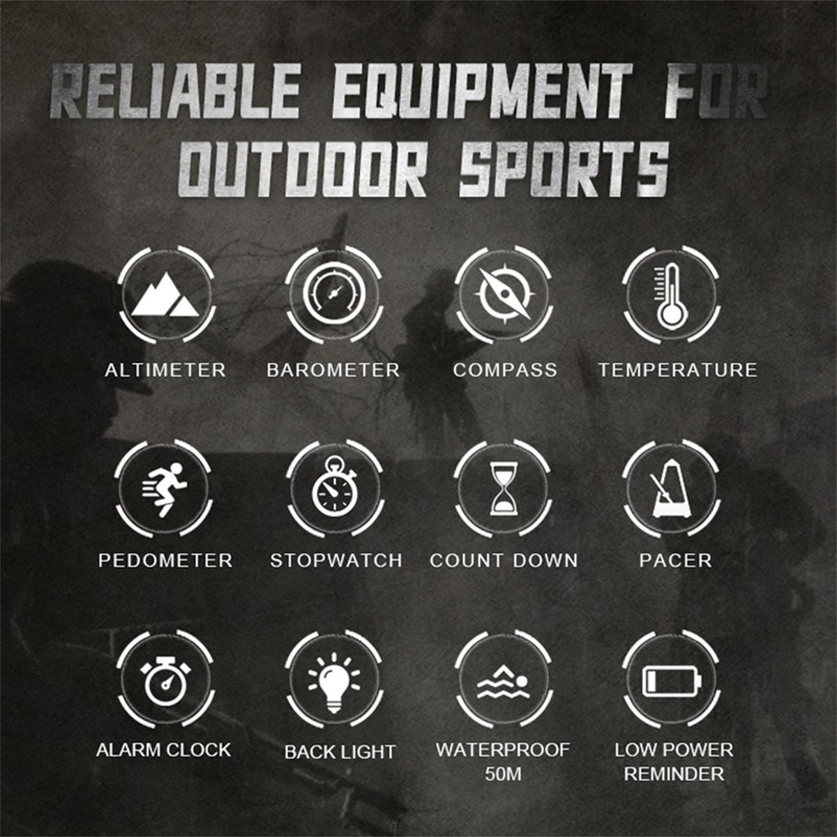 style men's outdoor electronic watch with altimeter, stopwatch, pacer, barometer, temperature, compass, and waterproof. Suitable for various outdoor activities.