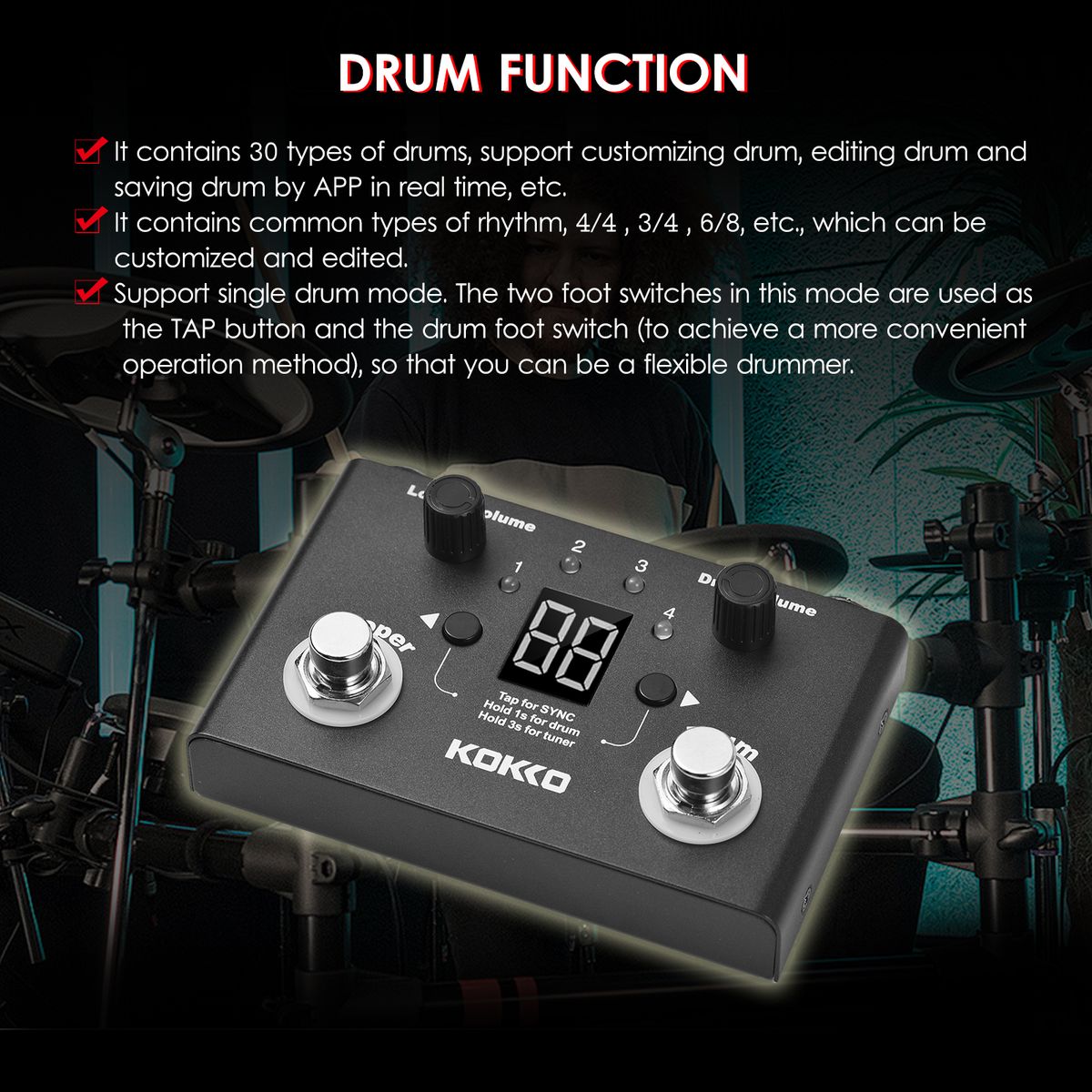 Drum: it contains 30 types of drums, support customizing drum, editing drum and saving drum by APP in real time, etc. It contains common types of rhythm, 4/4 , 3/4 , 6/8, etc., which can be customized and edited. Support single drum mode. The two foot switches in this mode are used as the TAP button and the drum foot switch (to achieve a more convenient operation method), so that you can be a flexible drummer.