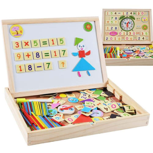 Multifunctional Learning Box ... Multi-Functional Digital Computing Learning Box is an interesting toy for early mathematical learning, children can also learn about time, and it comes with a clock to learn time, blackboard, chalks, and eraser for kids to drawing or writing. This tool helps kids to learn about basic arithmetic operations, such as addition & subtraction, multiplication & division. The sticks are all dyed in different colors, and the numbered blocks are very well made and sturdy.
