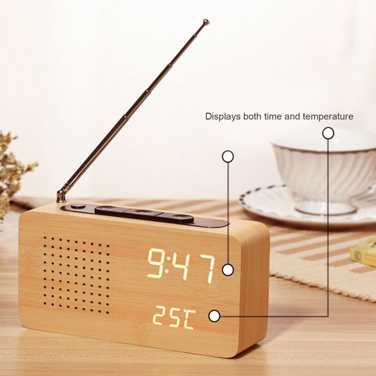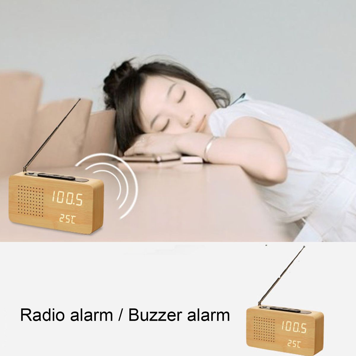 Multifunctional wood clock radio, radio alarm and buzzer alarm two ways can be set.