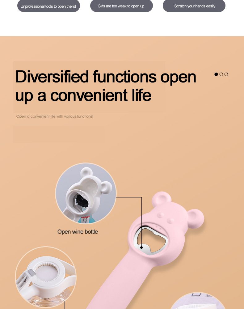 Multifunctional Four-In-One Safety Can Bottle Opener! This convenient tool features 4 types of openers: jar lid hook, can tab claw, screw cap opener and crown cap opener.