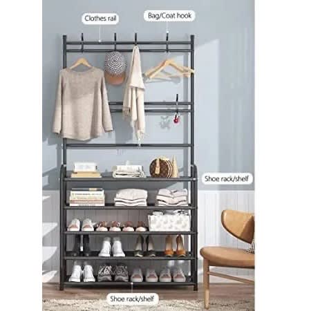 Standing tall in fashion and with functioning simplicity design and style, this elegant coat stand will let your hallway, entryway or balcony more organised.It is really part of an essential unit of your daily life.This unit offers you a clutter free home and a comfortable life.With the precisely design, the screws locate in the hole well and the holes are line up with the shelves.The metal outer layer is painted by baking varnish, being rustproof.A perfect coat rack and shoe storage bench, allow you to hang your clothes, bags, umbrellas, and store your shoes, storage boxes handbags in a limited space.Material: MetalStyle: ModernAssemble Size: 60cm L * 26cm W * 171cm H
