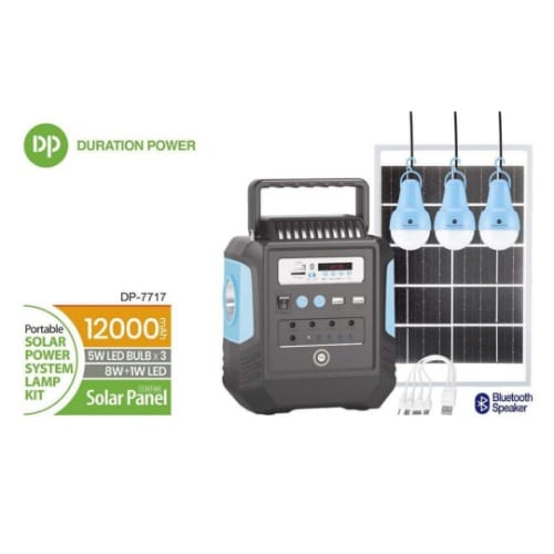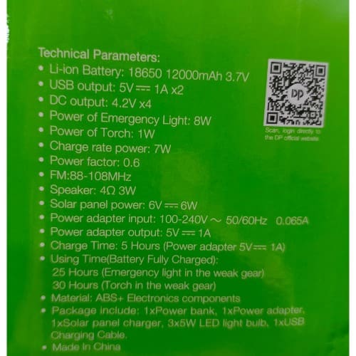 Package Include (1 power box, 1 power adapter, 1solar panel charger, 3 x 5W Led bulbs, 1 multi - USB cable)
