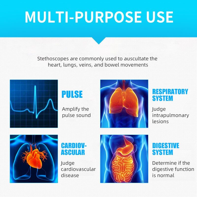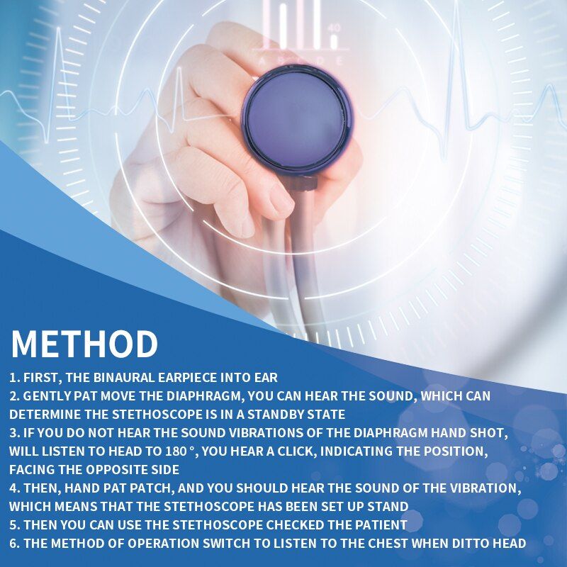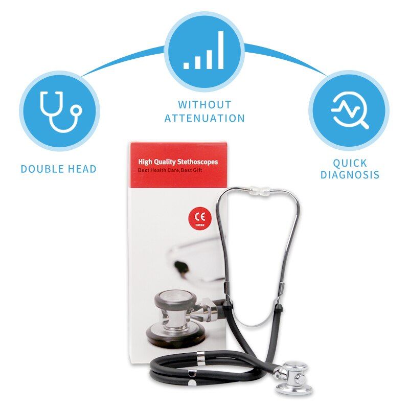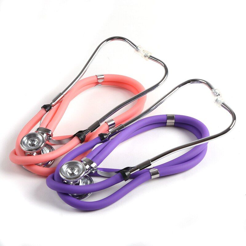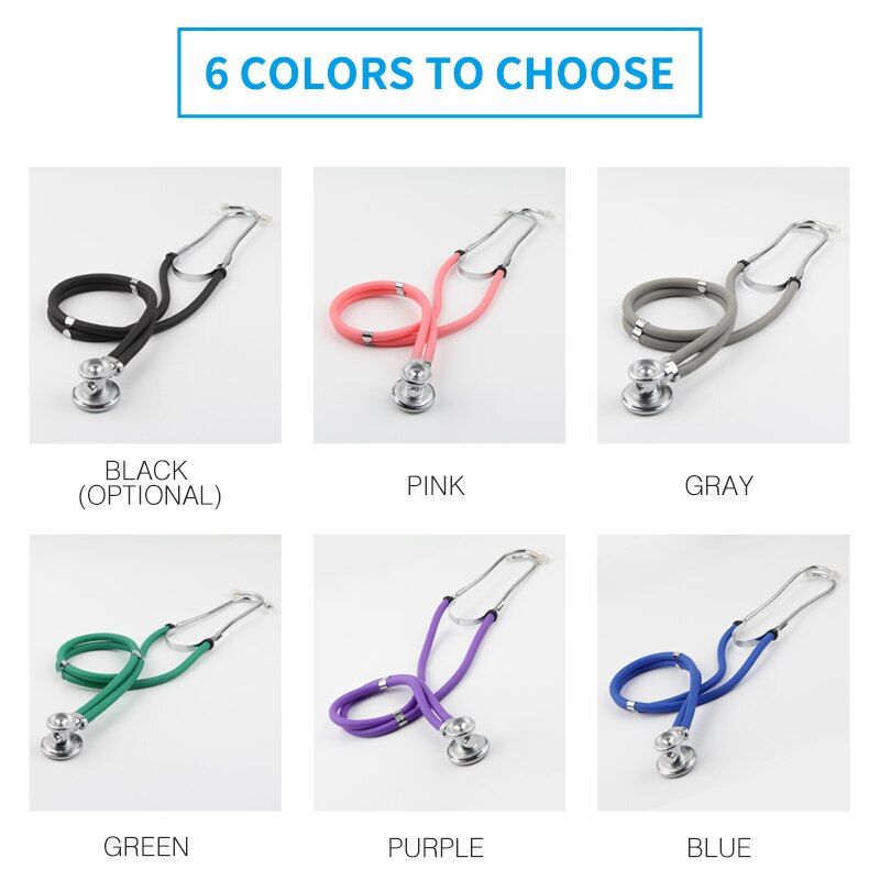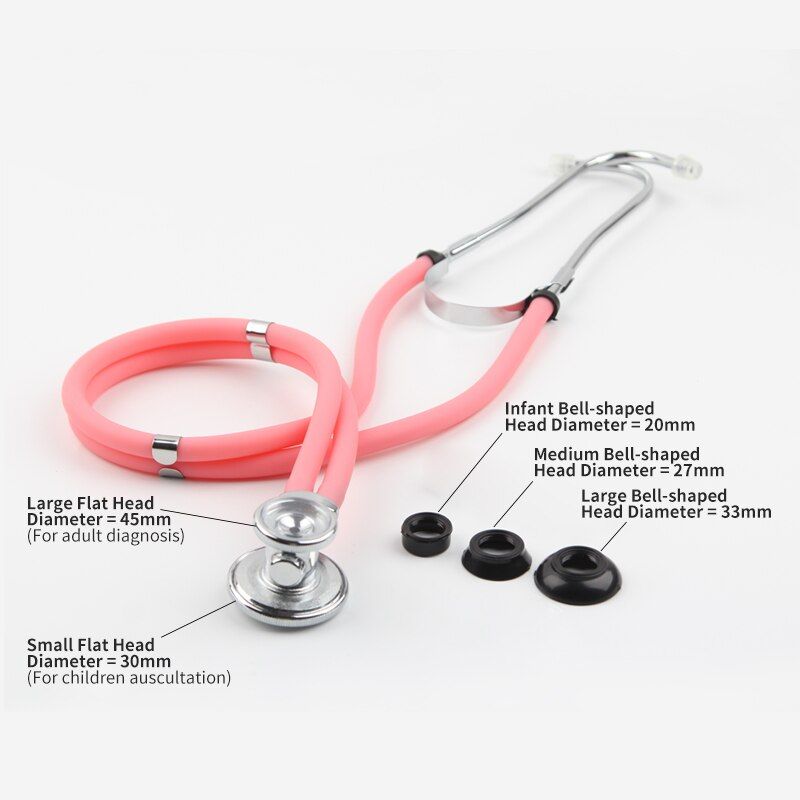 De sciption: Best Health Care, Best Gift! This multifunctional Stethoscope is double head Stethoscope and designed for all auscultation. Acoustic transmiion in the heavy metals did not decay, the real clear without attenuation. Help you fast diagnose heart disease,taking special care of your physical health. It is widely applied for cardiovascular and reratory auscultation in hotal, clinic, school, or home. Specification: Item name: Dual-head stethoscope Application: Arm Blood Preure stethoscope Properties: Medical Material and Acceories Head: Dual-head Fit for: Blood Preure Monitor with Stethoscope Material: Aluminum alloy + PVC Color: pink; purple; blue; green; gray; black (optional) Overall length: Approx.75cm Head large diameter about 45mm, head small diameter 30mm. Detail: Large Flat Head Diameter = 45mm. For adult diagnosis Small Flat Head Diameter = 30mm, For children auscultation Large Bell-shaped Head Diameter = 33mm Medium Bell-shaped Head Diameter = 27mm Infant Bell-shaped Head Diameter = 20mm Feature: 1. High quality, durable, Zinc alloy head, strong corrosion resistance. 2. Full copper ear hanging, high-grade material, good sound quality. 3. Y-tube design, more scientific and more accurate. 4. 5 way convertible design: large diaphragm, small diaphragm, adult size bell, medium size bell, infant size bell. 5. Adjustable Ear hanging with comfortable silicone eartip. Function: 1. Listen to fetal heart sounds heart rate. 2. Listen to the gastrointestinal motility. 3. Listen to the sound of the lungs. 4. Listen to heart rate blood veels of the noise. 5. Large bell-shaped head can auscultate. 6. Medium bell-shaped head for narrow areas, such as ribs and other narrow positions. 7. Small bell-shaped head, baby low sound quality, child buzzing sensitive. How to use: The versatile stethoscope with large and small size flat listen to block, mounted on double-headed drum can turn on which includes a very sophisticated anti-stem valve Ottawa 1. First, the binaural earpiece into ear. 2. Gently pat move the diaphragm, you can hear the sound, which can determine the stethoscope is in a standby state 3. If you do not hear the sound vibrations of the diaphragm hand shot, will listen to head to 180 °, you hear a click, indicating the position, facing the opposite side 4. Then, hand pat patch, and you should hear the sound of the vibration, which means that the stethoscope has been set up stand 5. Then you can use the stethoscope checked the patient. 6. The method of operation switch to listen to the chest when ditto head Package list: 1 * Stethoscope 1 * User Maunal 1 * Spares Acceories