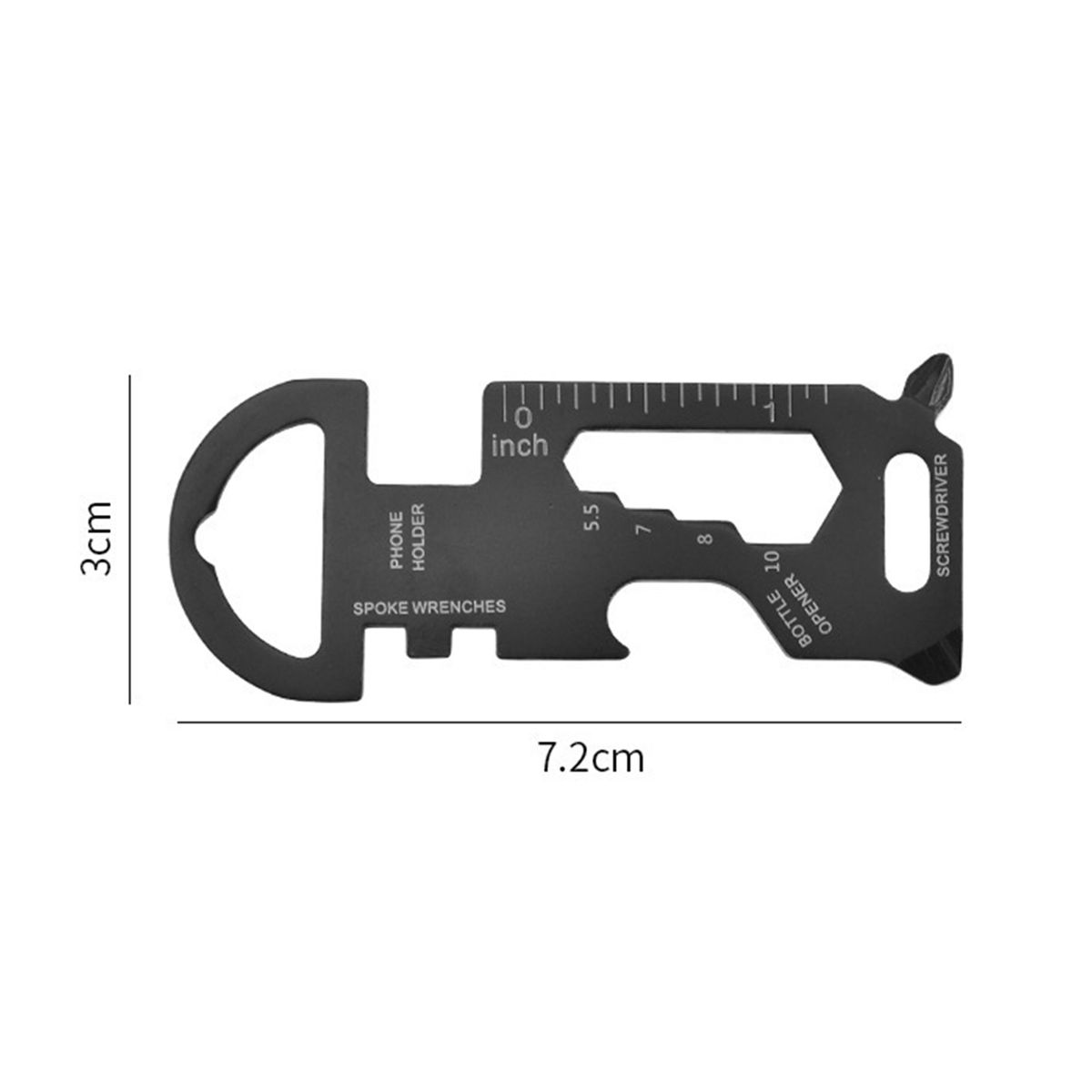 Function: Open End Wrench, Key Ring, Hexagon Wrench, Bottle Opener, Measuring Scale, Flat Head Screwdriver, Cross Head Screwdriver, Phone Holder