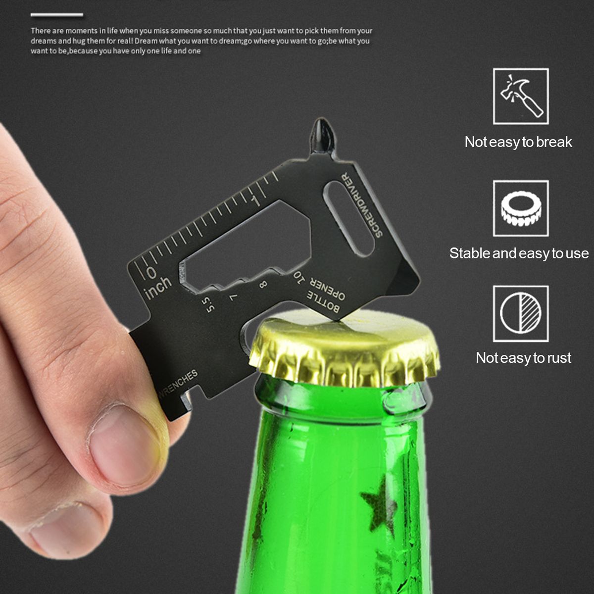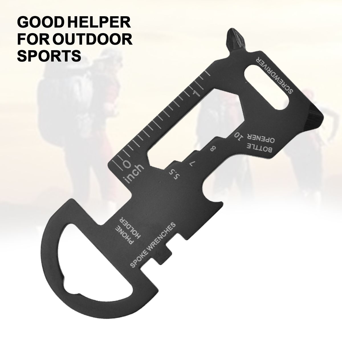This multitool card is characterized by multifunctional design, which enables it to be used as open end wrench, key ring, hexagon wrench, bottle opener, measuring scale, flat head screwdriver, cross head screwdriver, phone holder to meet your daily needs.
