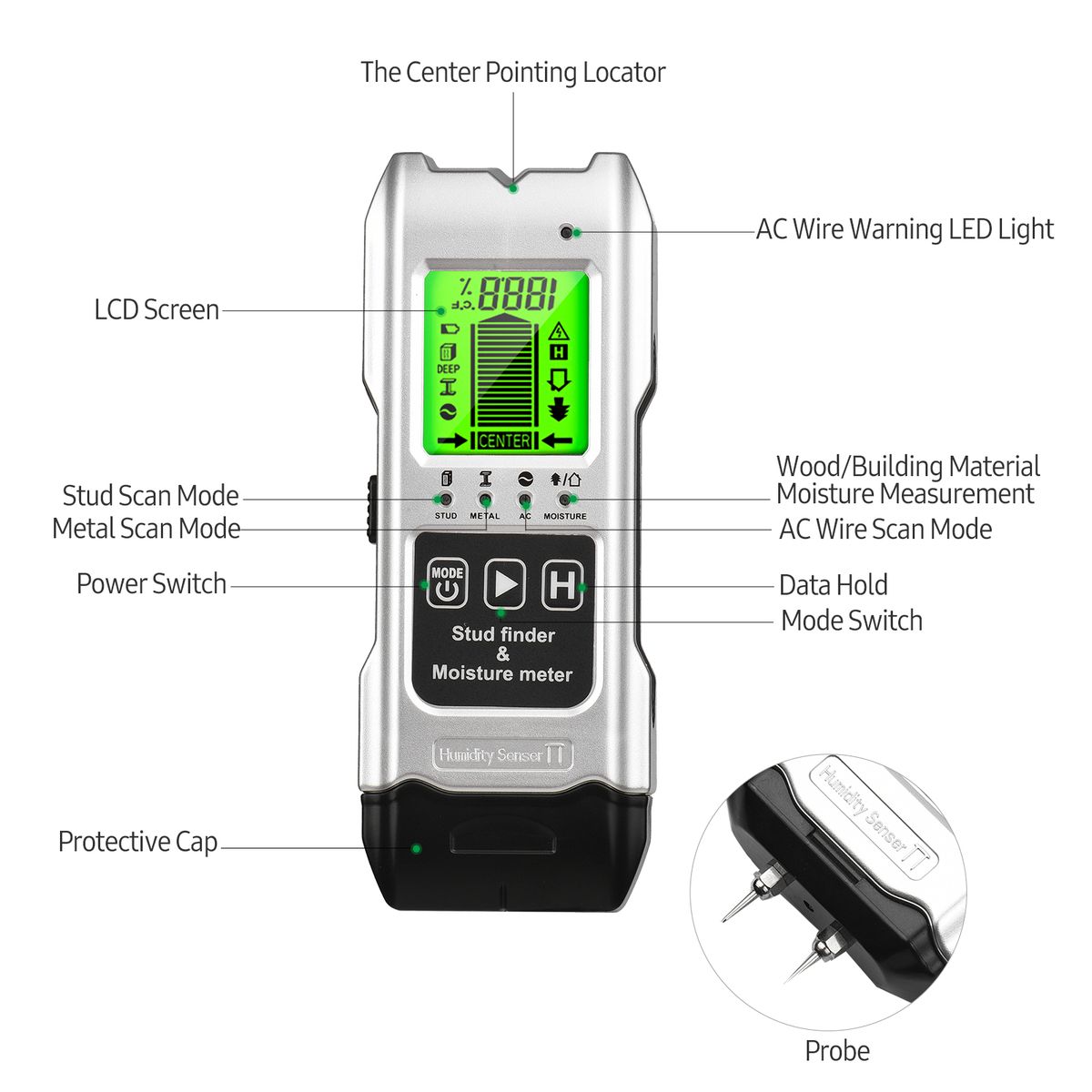 Professional Wall Stud Finder: it has 3 different scanning modes to detect studs, metal, and live unshielded AC wiring behind wall, floor, and ceiling, as well as detecting rebar in concrete.