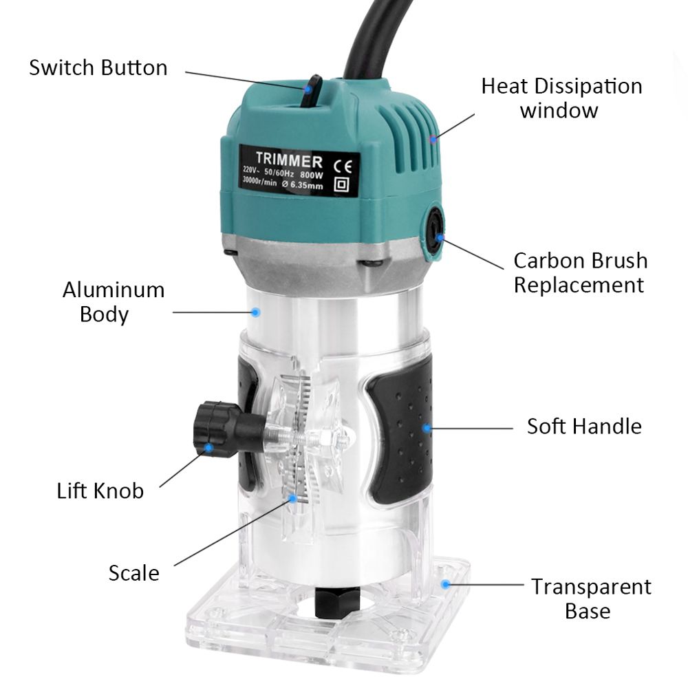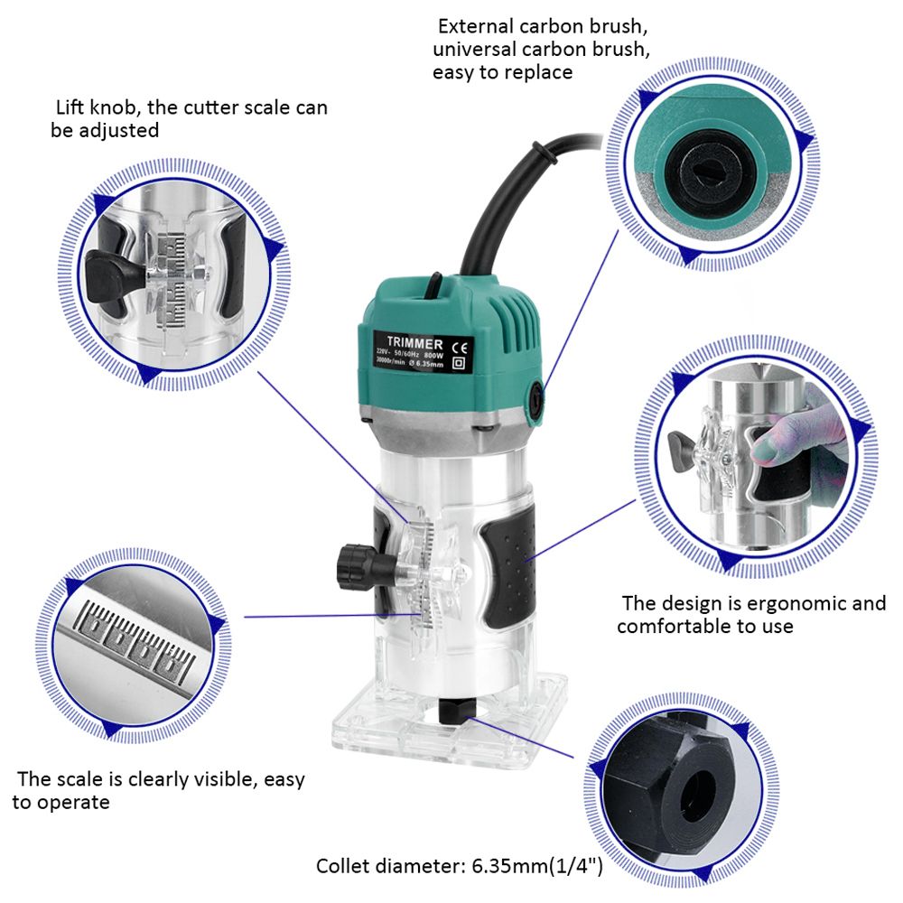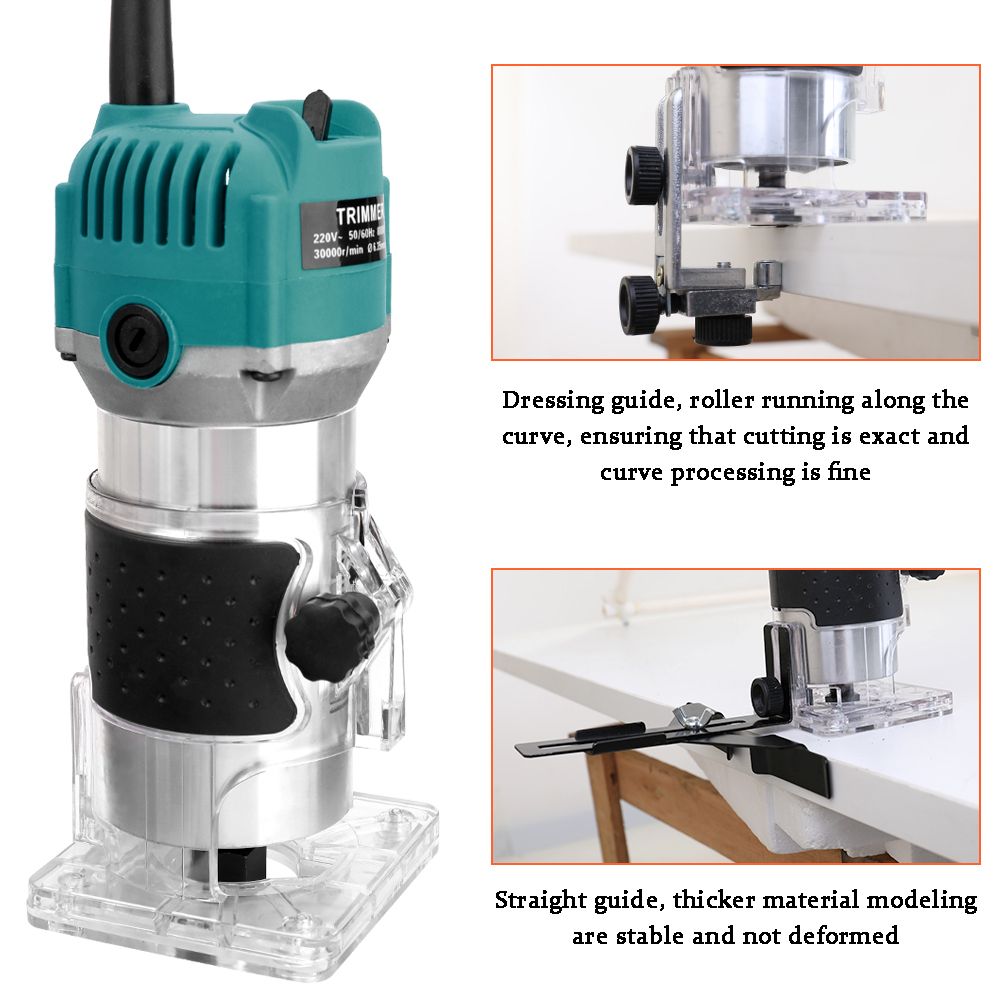 This product can be used for wooden processing, cabinet processing, handicraft production and DIY. Easy for wood trimming, grooving and drilling, with transparent base, processing accuracy can be easily recognized.