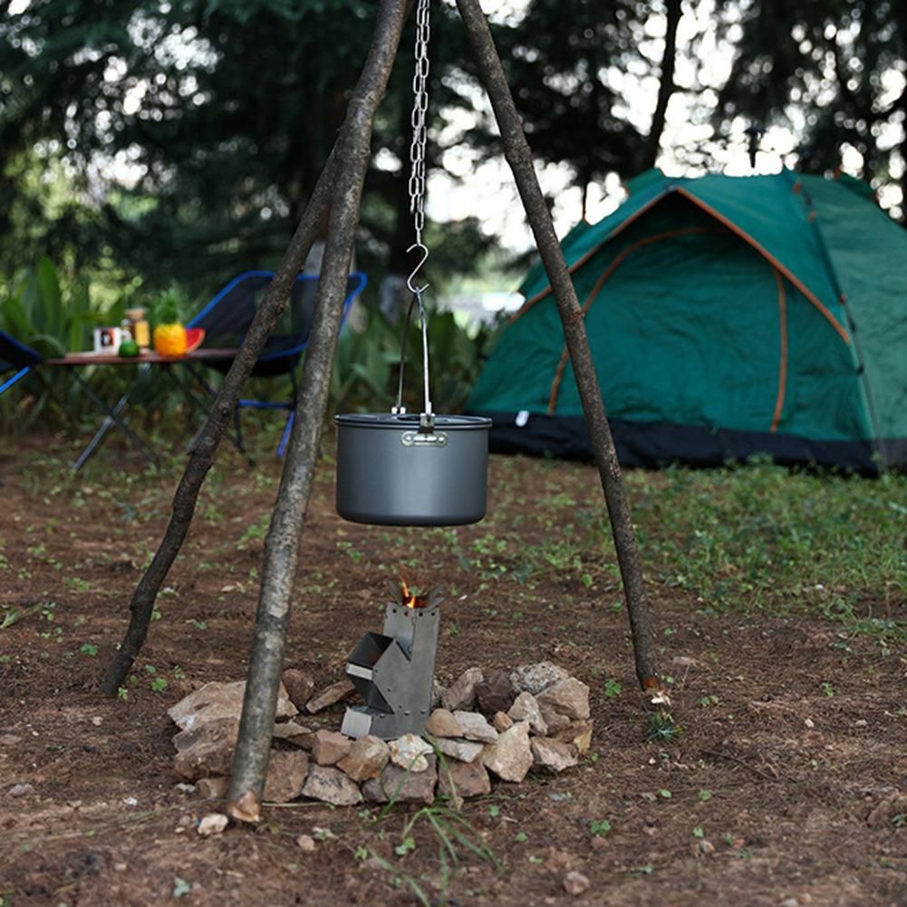 Simple to use :When you are having a picnic outside,just find three branches of the right size,they were then connected using our three-hole design tripod, you get a sturdy tripod,adjust the chain height, put away the things you need and start the exciting picnic