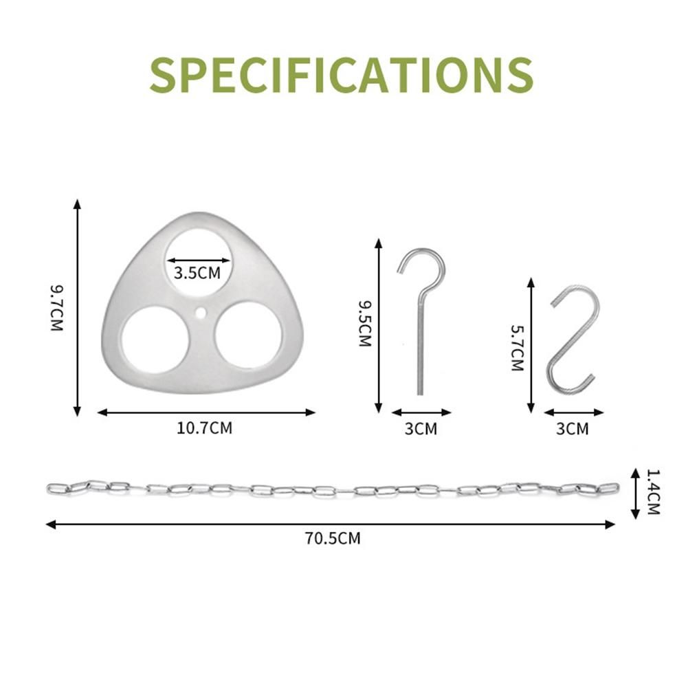 Size:Stainless steel disc length 4,2in/10.7cm wide 3.8in/9.7cm round hole diameter 1.3in/3.5cm Branch diameter less than 1.3in/3.5cm can be used,adjustable chain 27.7in/70.5cm, hook length 3.7in/9.5cm,The s-hook is 2.2in/5.7cm long