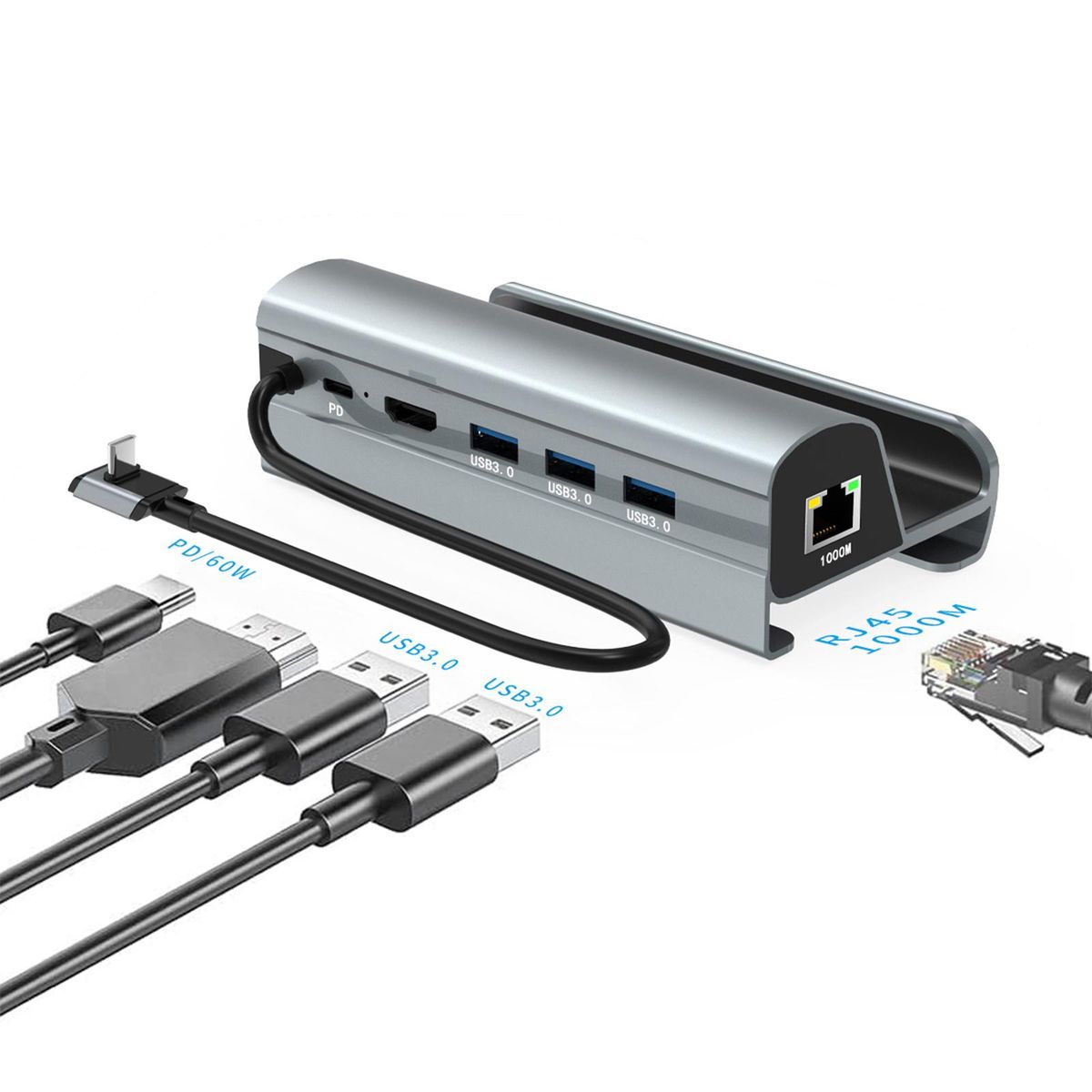 6 Ports USB Hub:docking station includes 1 PD charging port,4K,3 USB 3.0 ports, 1000M/S.