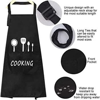 with adjustable neck straps and a wide pocket that allows storage for mobile phones or many kitchen tools like a spoon, seasoning packets, meat thermometer, grill slips and recipe cards, etc. the surface has a waterproofing coating to prevent oil splashes