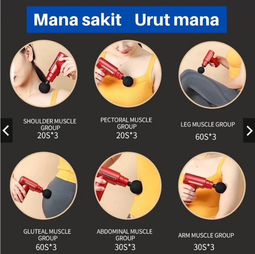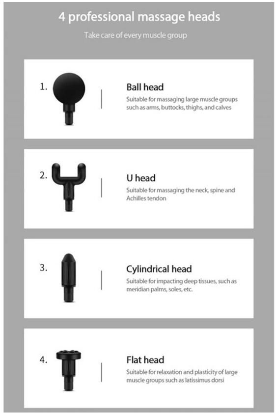 ** Note: Please charge for 4 hours upon received, before use it for the first time.6 Speed Mini Massage Gun With 4 Head Compact SizeLED Digital Display and Portable Muscle RelaxationMassage FitnessPackage Included1 x Mini Massage Gun4 x heads1 x USB cable1 x Storage box