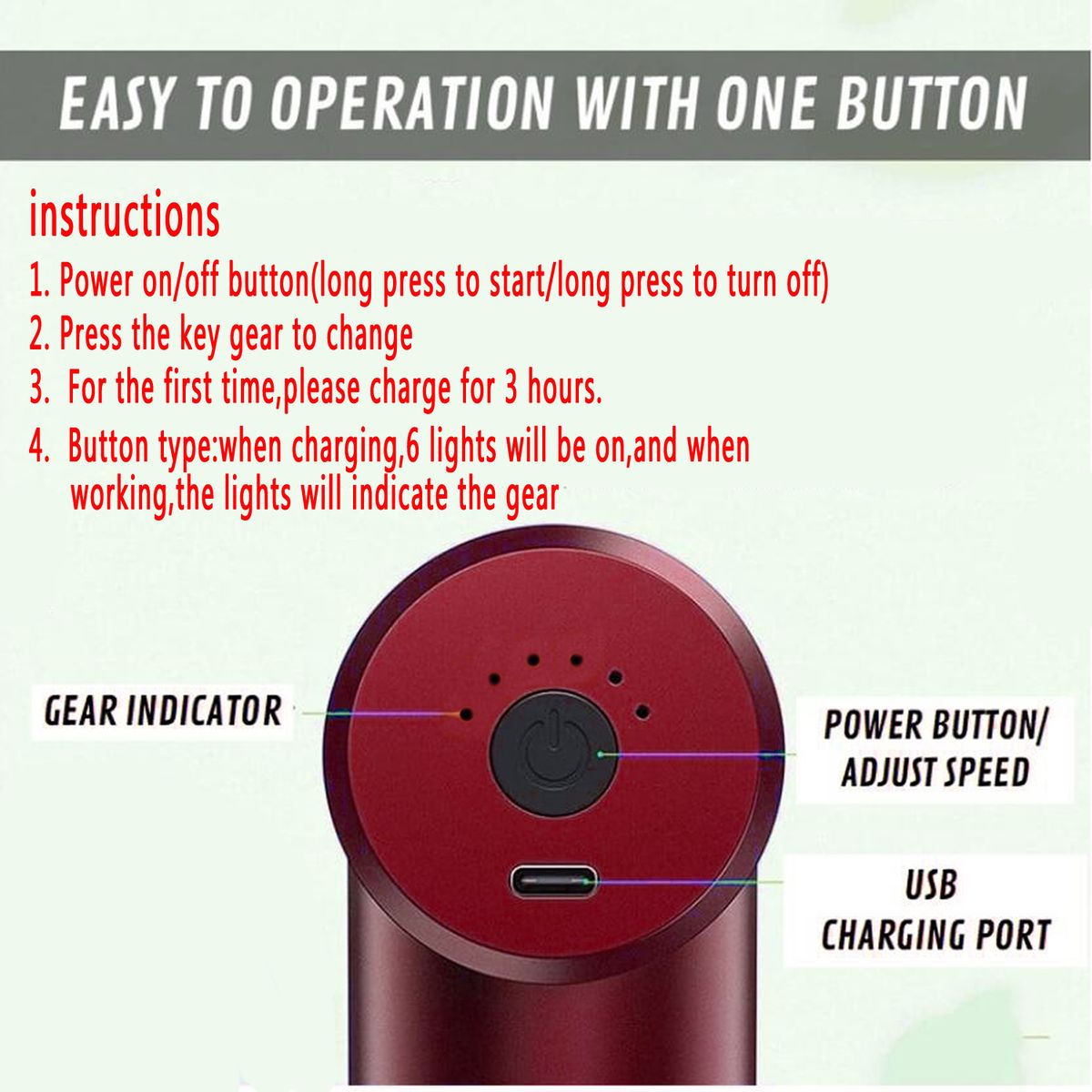 Mini Fascia Massage Gun 6 Speeds With 4 Massage Heads LCD Screen Digital Display Compact Size Portable MuscleSpecifications:Material: MetalColor classification: RedChoose according to fitness effect: muscle relaxationMassage head material: ABSApplicable object: general purposeMotor type: Brushless motorIs it the same as the store: YesType of intelligence: other intelligenceBattery capacity: 1800mAhMaximum power: 30WBody weight: 0.6 kg and belowNo load power: 60WEnergy consumption: 30Wh6-level variable frequency vibrationNoiseless & Peaceful operationLong Lasting BatteryLED digital displayinstructions1. Power on/off button(long press to start/long press to turn off)2. Press the key gear to change3. For the first time,please charge for 3 hours.4. Button type:when charging,6 lights will be on,and when working,the lights will indicate the gear position.