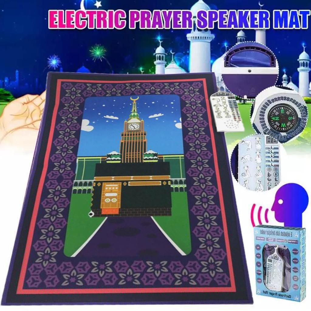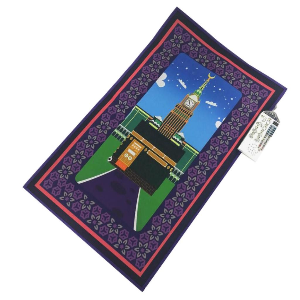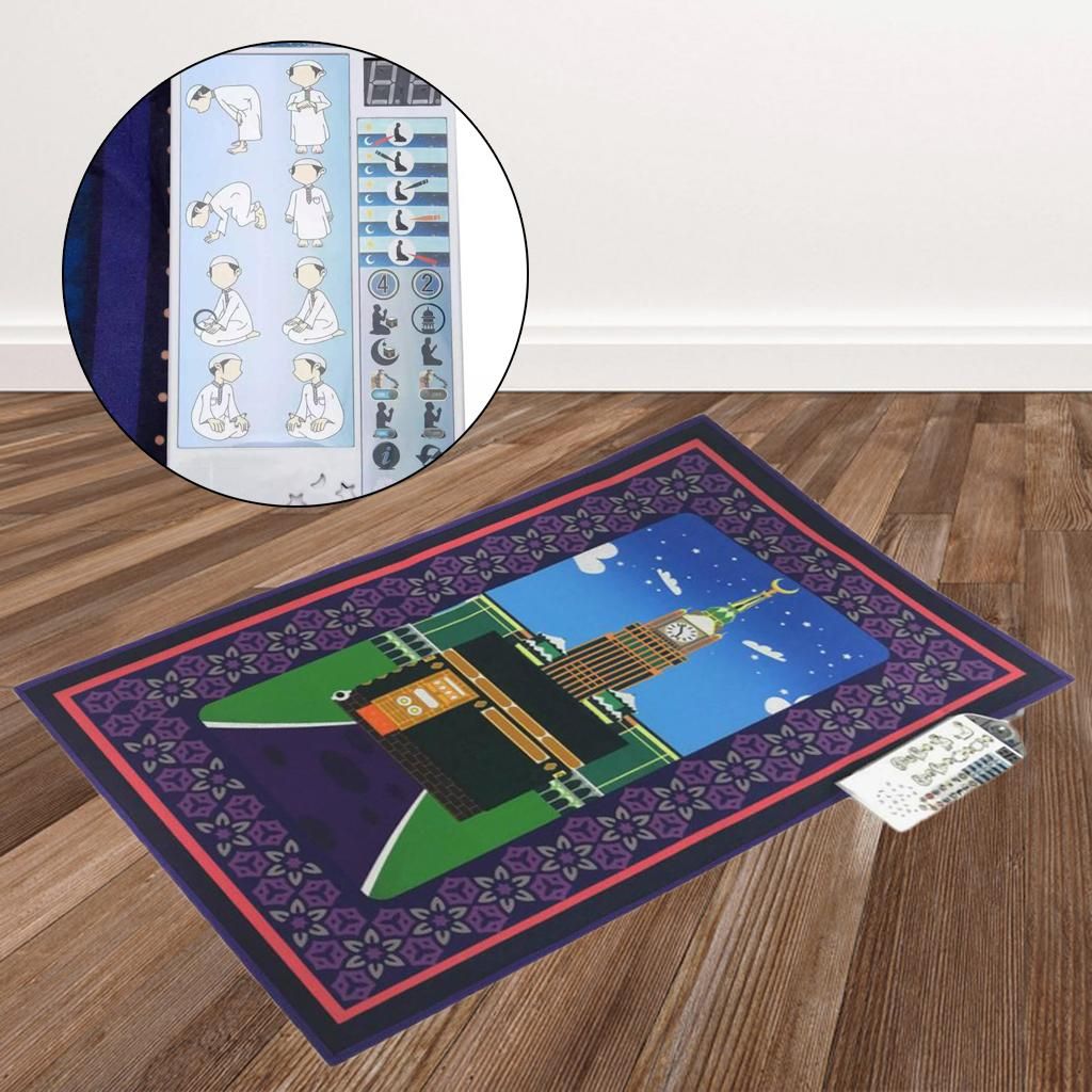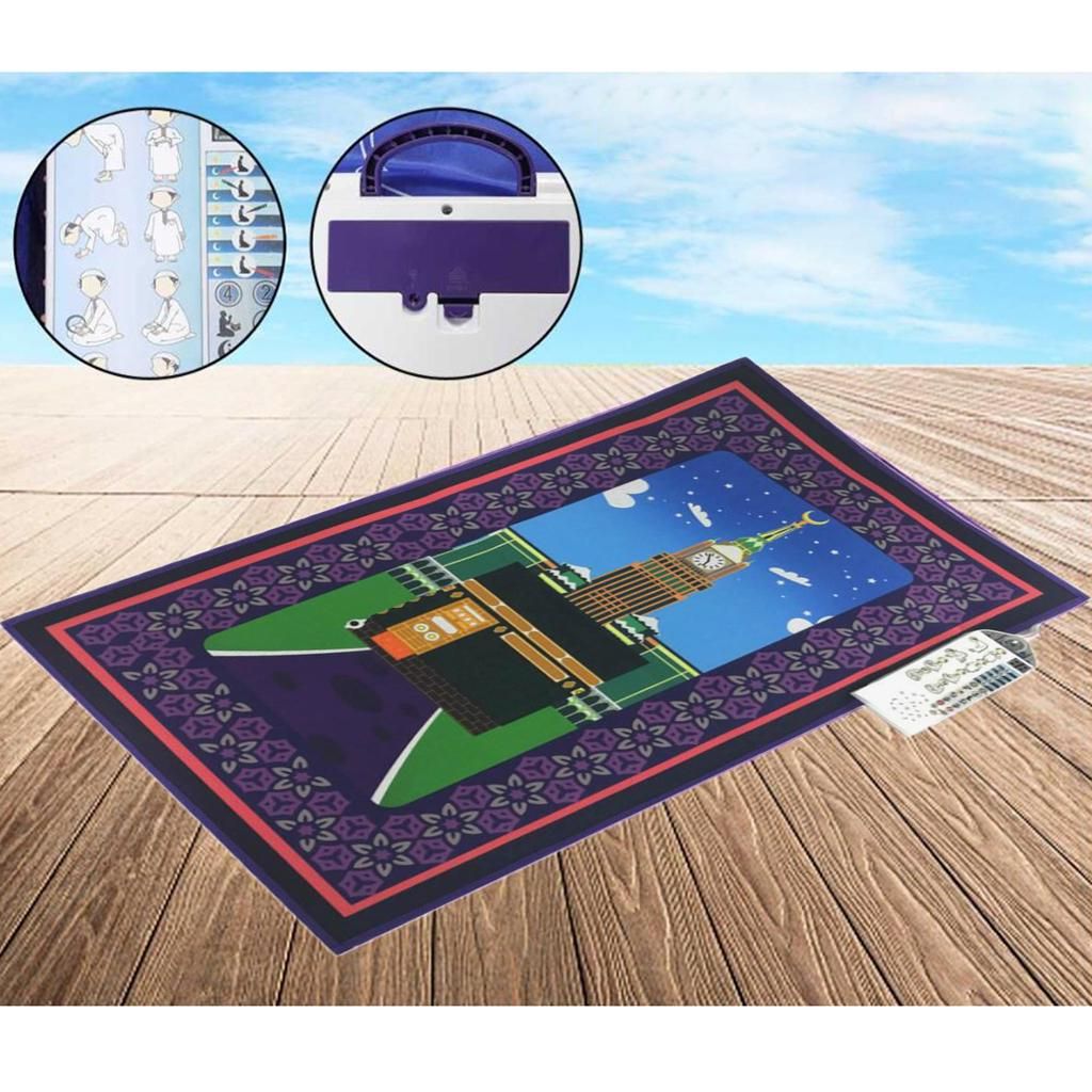 This smart intelligent islamic educational interactive Muslim prayer rug is used to educate children on how to perform the Muslim prayer in a fun and enjoyable way.Islam praying mat carpet has accurately recorded the contents of worship and standard movement tips songs for teaching child to pray.7 Different Languages (English, French, Arabic, Malaysian, Indonesian, Turkish & Urdu) and for different times of salah.The interactive prayer mat is touch sensitive and has pre-recorded keys that can be touched to reveal the sound, such as prayer times, how to do wudu, recite surahs, say duas, and much more.Made of non-woven fabric, smooth surface for easy cleaning and comfortable to use, foldable design for easy to carry with you.