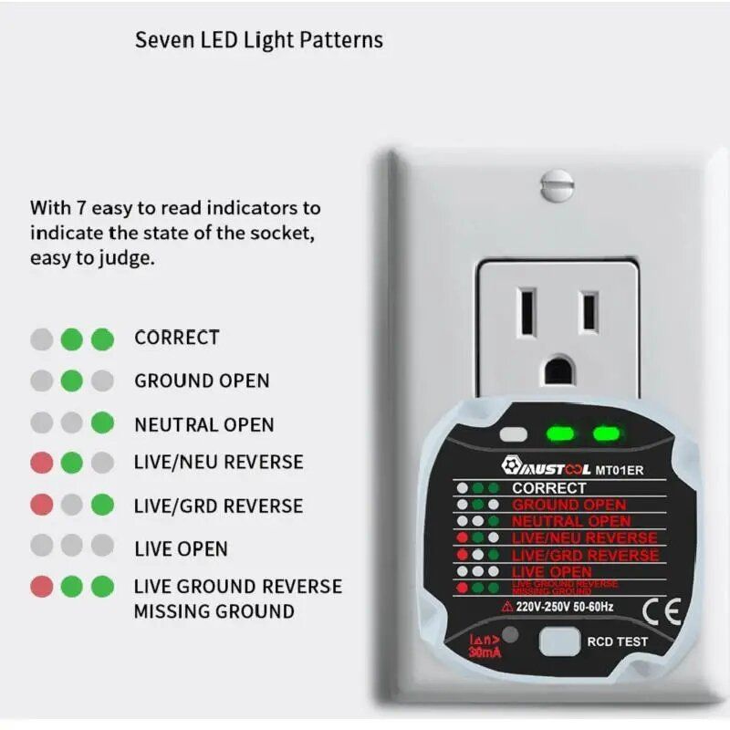 7 LED light patterns: with 7 easy to read indicators to indicate the state of the socket, easy to judge.