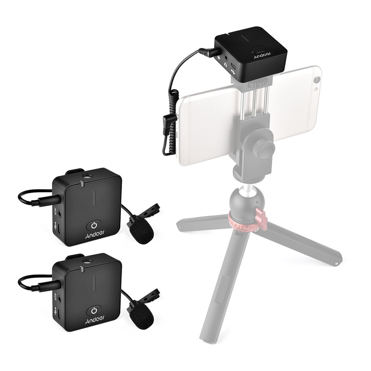 2 x Transmitters,1 x Receiver,2 x 3.5mm Audio Cable,2 x Lavalier Microphone,1 x USB Cable,1 x Users Manual(English)