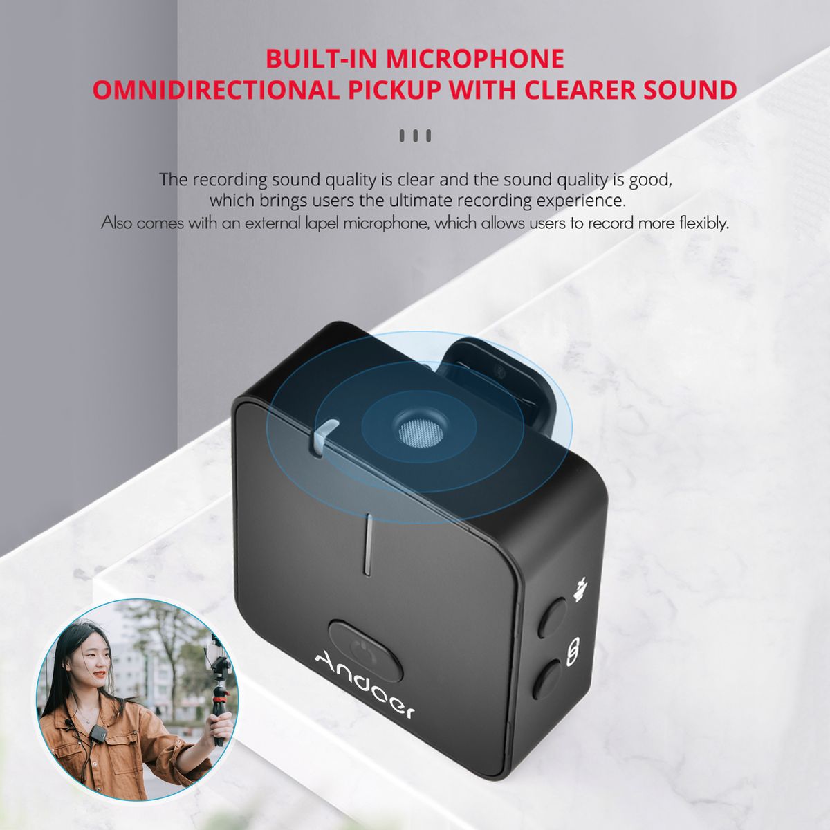 【Dual Microphones Design】The transmitter has built-in microphone and supports omnidirectional pickup with clearer sound, also comes with an external lapel microphone, which allows users to record more flexibly.