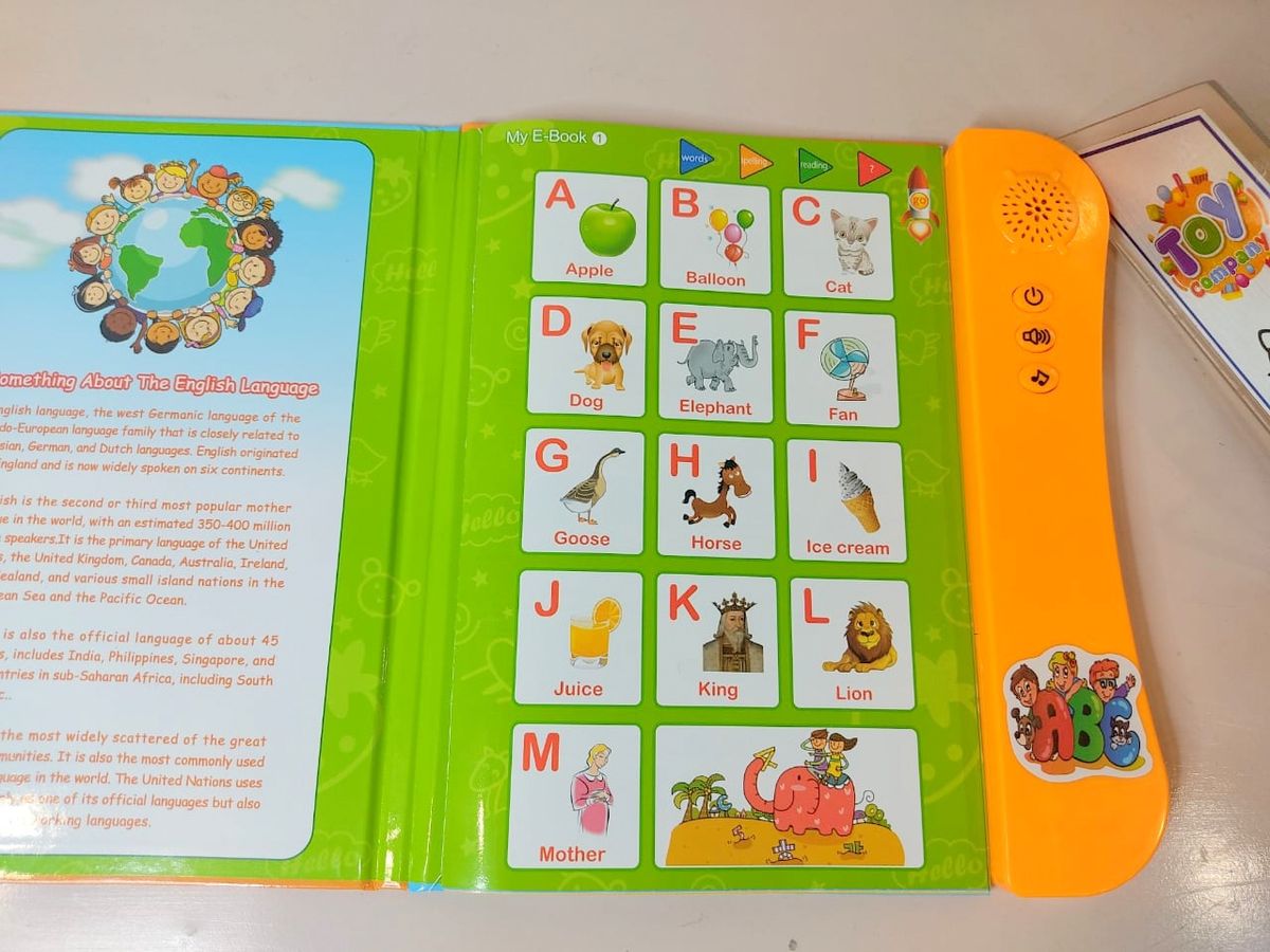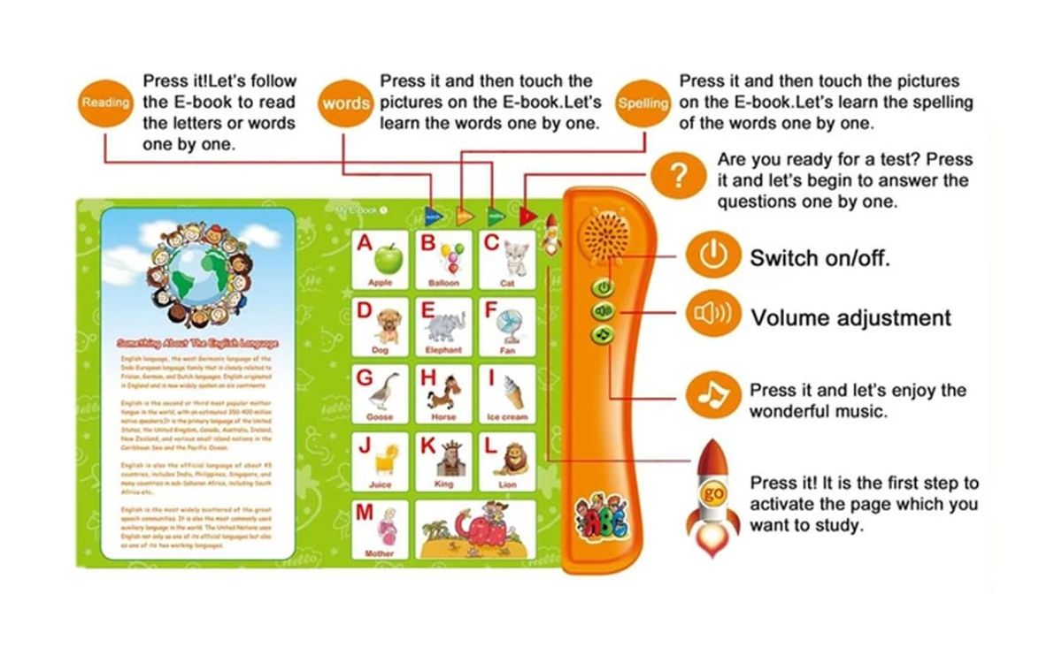 CHILD DEVELOPMENT - The learning book provides: Phonetic learning; Parent-child interaction; Improvement of children's hands-on ability, Thinking & Hearing ability; Inspires children's potential; Encourages interest in learning.[RICH CONTENT ] The book includes: Alphabet; Simple Words; Animals; -Numbers; Fruit; - Vehicles -Vegetables; -Colours; Shapes, Songs[CONTROL BUTTONS] Right side of the book is located control buttons: Volume, Songs, SWITCH.[HOW TO USE] Up of the pages are located the following buttons: Read, Question, Learn and Switch (right corner of every page). . The buttons are operated with touch of fingers. SWITCH button is switching to the page you have opened and playing the current page. QUESTION button will ask the question like " Where is uncle?", and the child needs to point the correct answer on the page with finger. READ button will pronounce whatever on the page is.[GIFT IDEA] This book is a perfect present idea for any occasion due to its presentable design, multi-functionality and uniqueness.