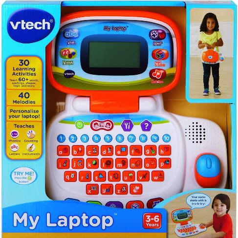 My Laptop for toddlers from Vtech encourahes logical thinking, visualisation skills and hand-eye co-ordination of the toddlers. It is a child-friendly four directional mouse and 30 fun and educational activities, and it teaches age appropriate curriculum including phonics, counting and spelling letters. You can customise the laptop with your child's name, age and favourite food in the All About Me Mode on the laptop. This laptop requires 2 x AAA batteries to function.