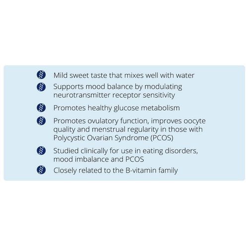Mood balance and brain function: Found in abundance in the brain, inositol is involved in neuronal signaling and the healthy regulation of several hormones and neurotransmitters. At 3 scoops, inositol helps to reduce feelings of low mood. It has been studied in anxiety, OCD, and eating disorders related to bingeing.
