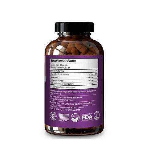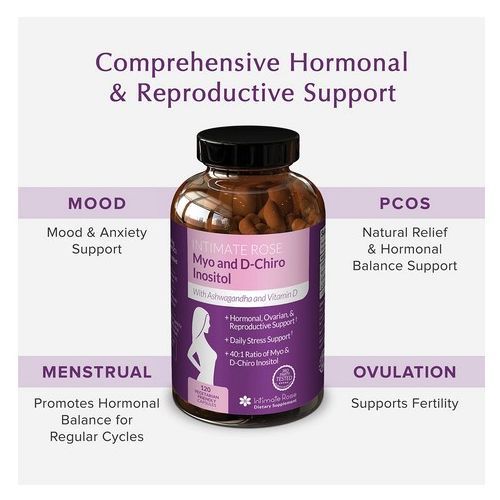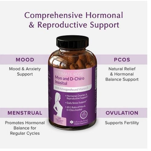 The one-of-a-kind blend of inositols and vitamins combine to provide hormone balance, lowered androgens, fertility support, and mood and stress support. We understand the symptoms you're facing and decided to go above and beyond the competition to better help YOU! Intimate Rose's one of a kind Inositol Blend features Ashwagandha and Vitamin D which can have added positive effects on stress, anxiety, and mood. PCOS and related side effects are stressful! No other Inositol supplement on the market includes these extra mood-enhancing ingredients.