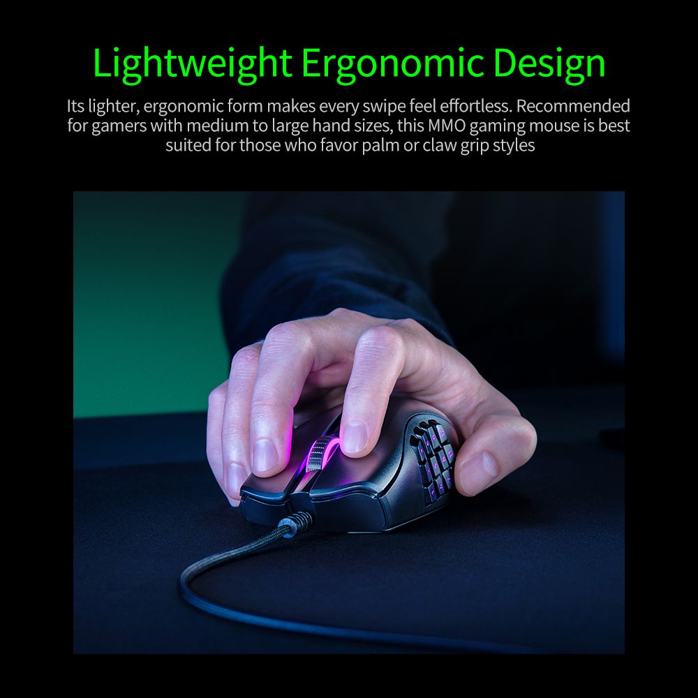 Its ligh-ter, ergonomic form makes every swipe feel effortless. Recommended for gamers with medium to large hand sizes, this MMO gaming mouse is best suited for those who favor palm or claw grip styles.