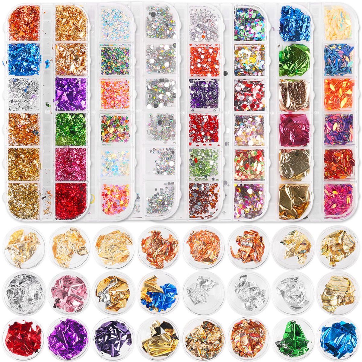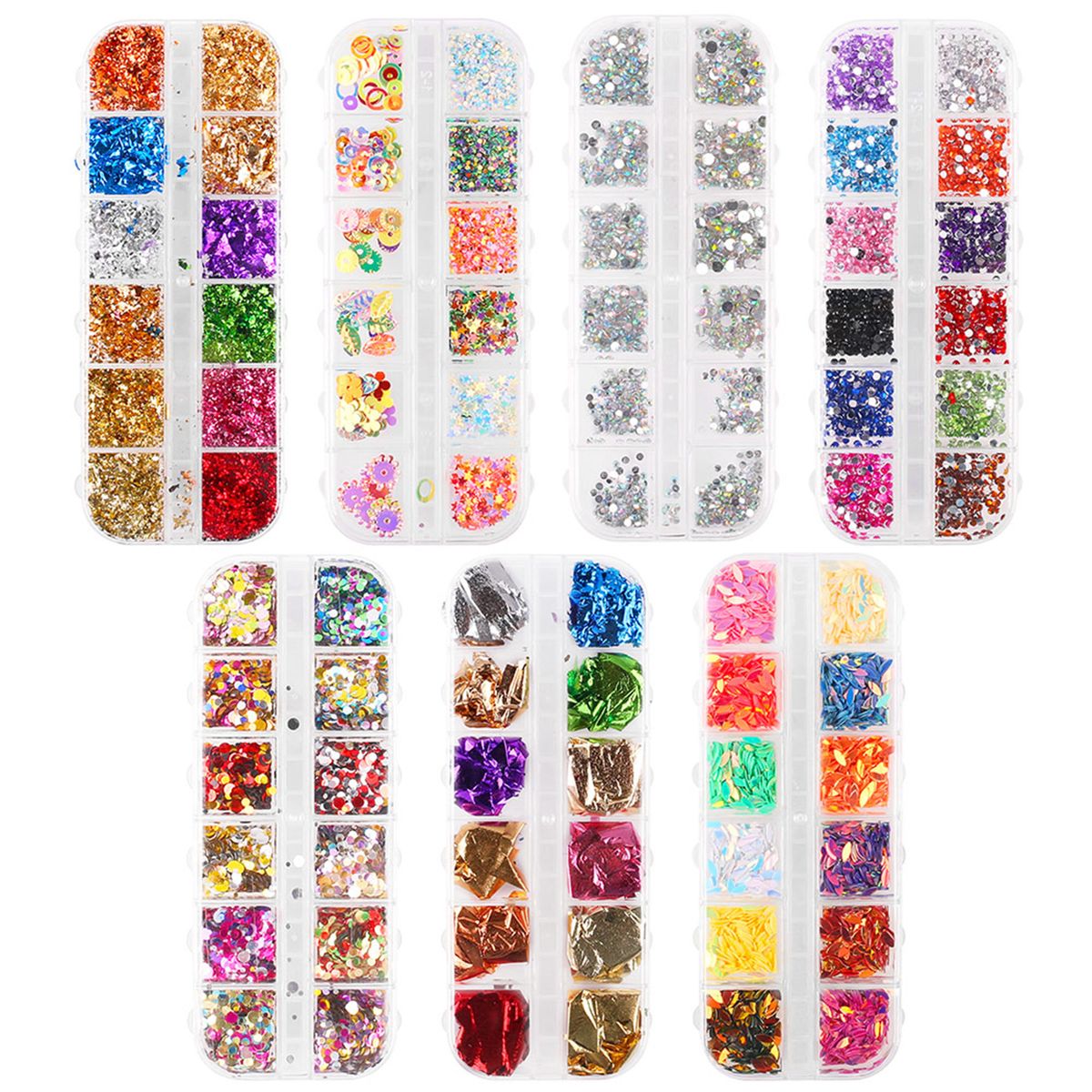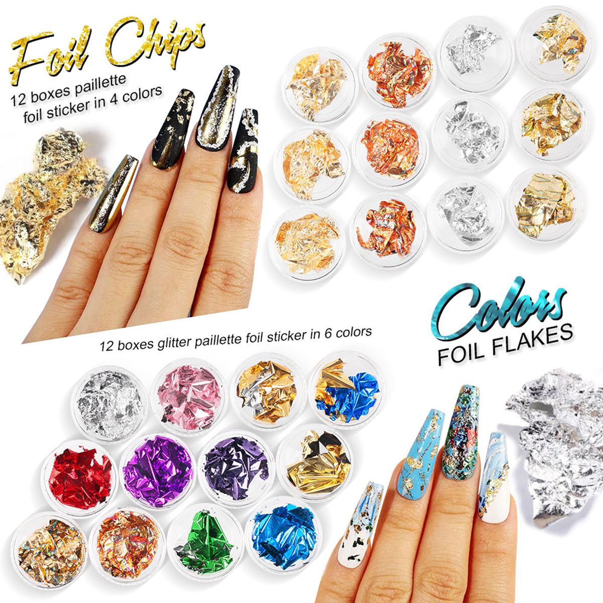Foil chips, 12 boxes paillette foil sticker in 4 colors, 12 boxes glitter paillette foil sticker in 6 colors.