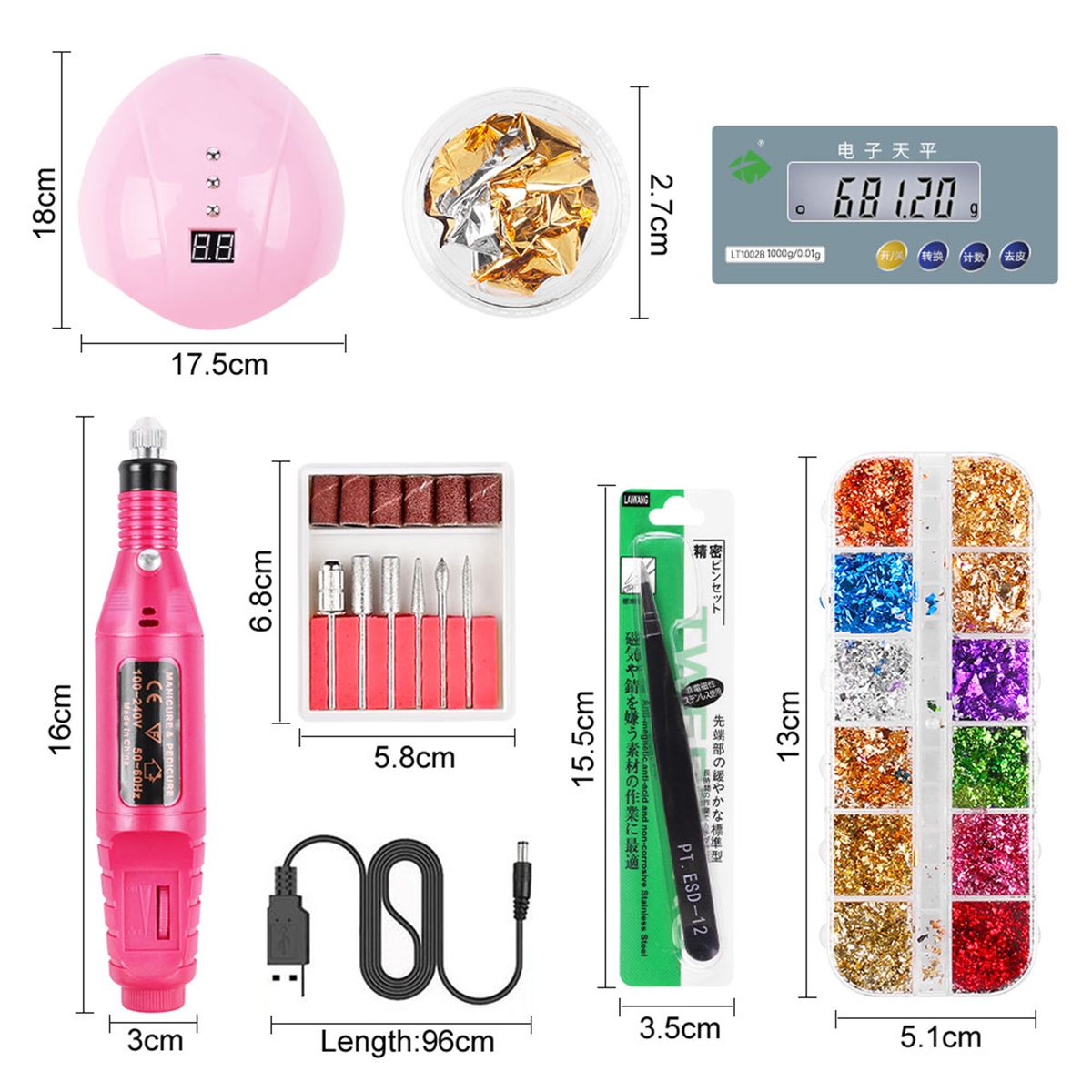 24 x Grids of Foil Papers,7 x Boxes of Nail Ornaments,1 x Straight Tweezers,1 x Curved Tweezers,1 x Nail Lamp,1 x Nail Drill Machine,1 x Box of Drill Bits,1 x USB Cable,