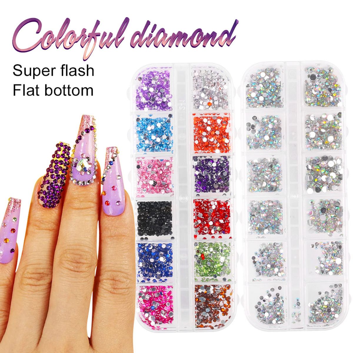 Colorful diamonds, dazzling gloss, flat bottom, easy to on nail.
