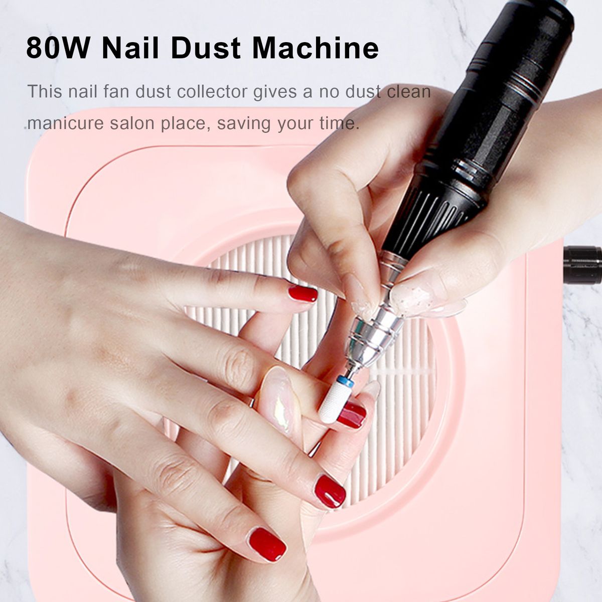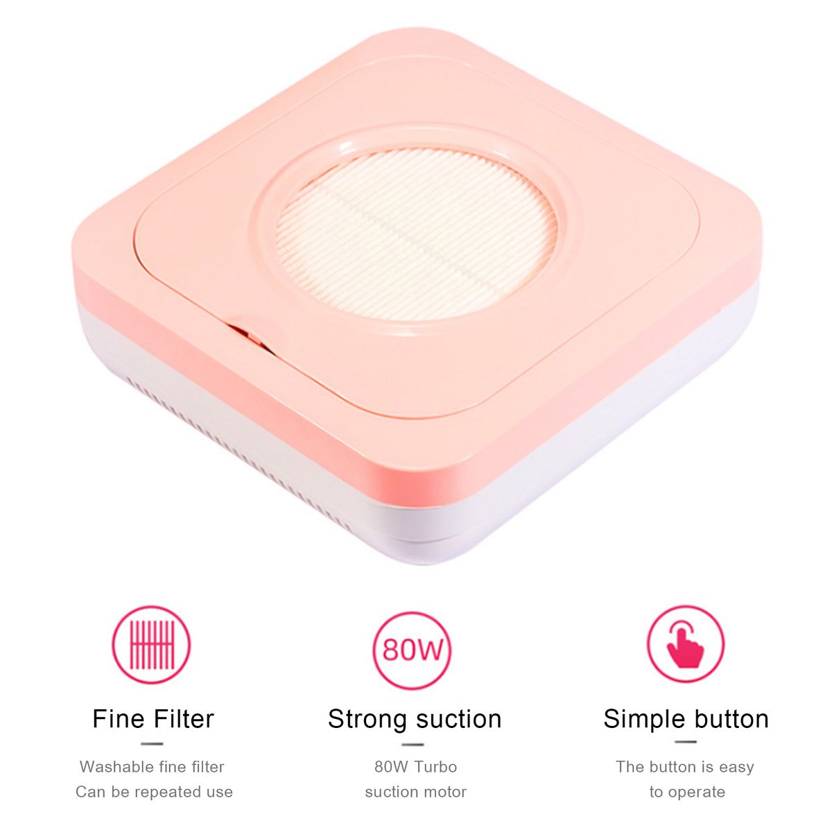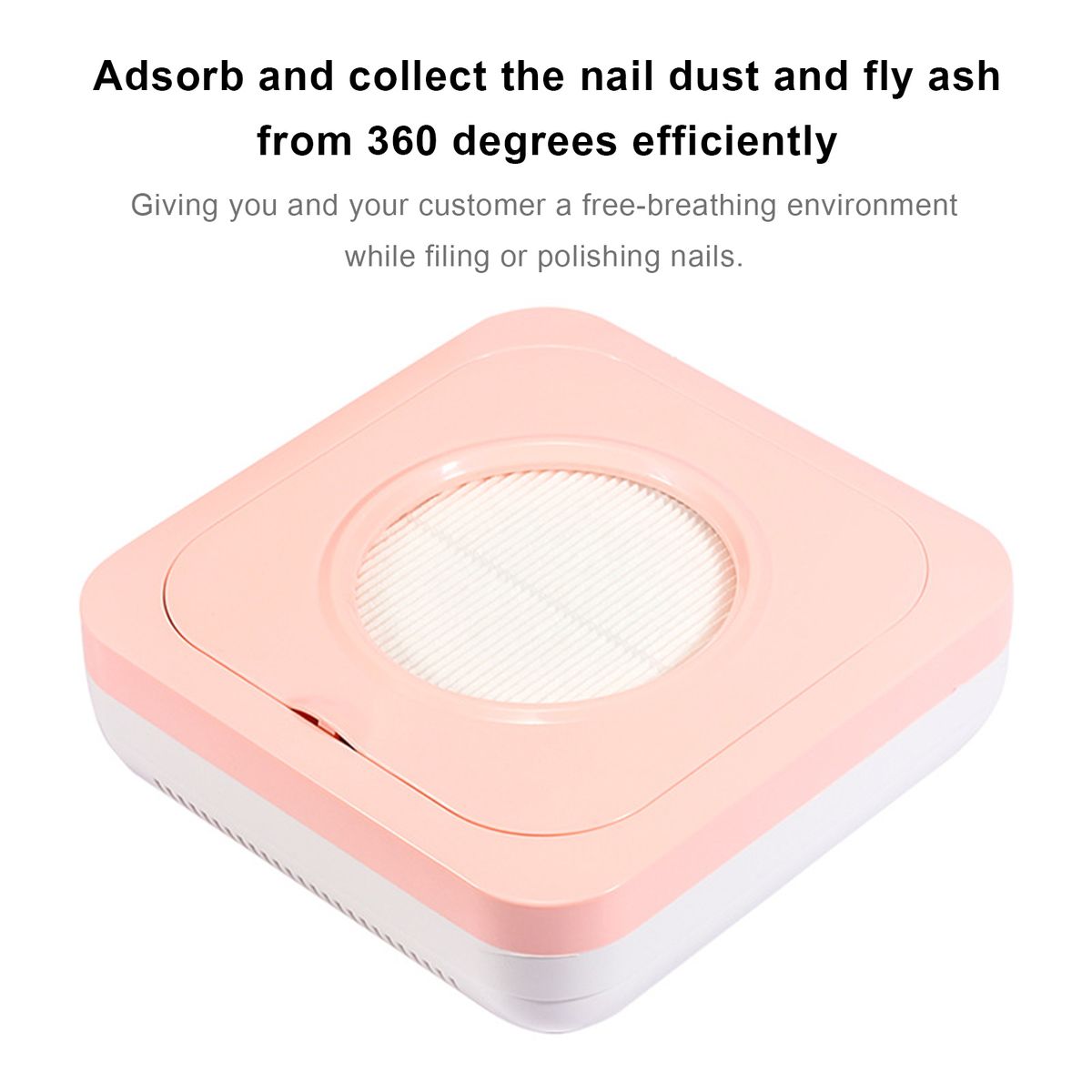 With high power suction fan and reusable fine filter, this dust vacuum can adsorb and collect the nail dust and fly ash from 360 degrees efficiently. Giving you and your customer a free-breathing environment while filing or polishing nails.