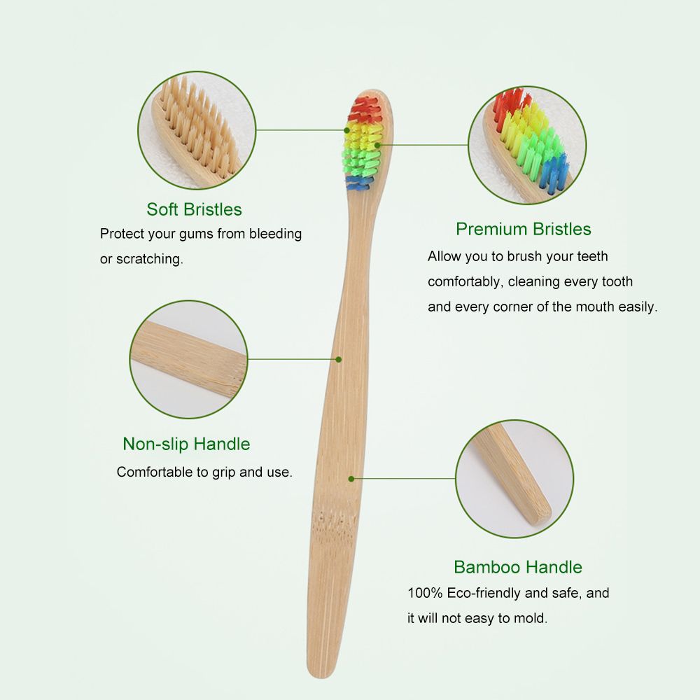 The bamboo toothbrush features natural bamboo handle and soft bristles, comfortable to grip and use. And the soft bristles will protect your gums from bleeding or scratching, allowing you to brush your teeth comfortably, cleaning every tooth and every corner of the mouth easily.Features:Made of natural bamboo handle, 100o-friendly and safe, and it will not mold. The bristles of the toothbrush are very strong and soft, not easy to fall off. Soft bristles will protect your gums from bleeding or scratching.Allow you to brush your teeth comfortably, cleaning every tooth and every corner of the mouth easily.Non-slip handle, comfortable to grip and use.Suitable for home or hotel use, or you can carry it to travel.Features:Material: Bamboo HandleColor(Bristles): Multicolor, Black, Red, Blue, Beige, White, Brown (Optional)Item Length: 174mm / 6.85inPackage Size: 185 * 25 * 15mm / 7.28 * 0.98 * 0.59in Package Weight: 14g / 0.49ouncePackage List:1 * Toothbrush