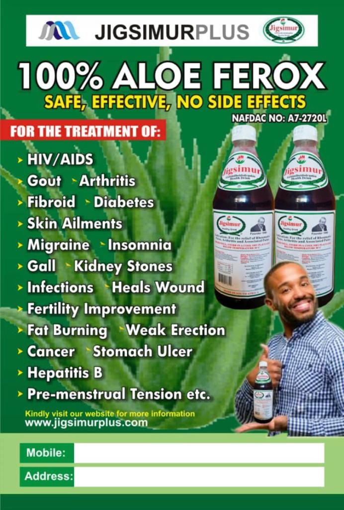 Jigsimur is a Traditional African Medicine(TAM) duly registered with NAFDAC(A7-2720L). Jigsimur is a blend of Aloe Ferox and all its phytonutrients that have been scientifically proven to prevent and cure common ailments and stubborn diseases. Jigsimur contains antioxidant , phyto-nutrient and anti aging elements that make it very ideal for both the young and the old. Jigsimur has no any side effects as all the blends are 100% Aloe Ferox.
