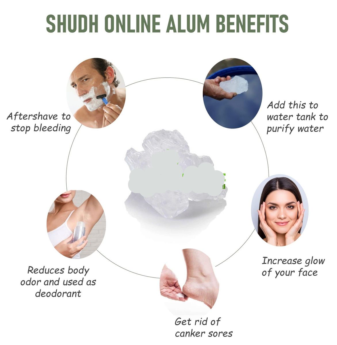 Uses of Alum :For Treating Canker Sores: Powdered alum can be used for treating canker sores. Simply, take a pinch of the powder and apply it on the affected area. It will bring down the pain and heal up the sores quite fast.As an Aftershave: It is being used as an aftershave for centuries. Take some alum powder and rub it thoroughly all over the freshly shaved face when the skin is still wet. Its astringent qualities will control bleeding from small shaving cuts and thus, prevent infection.For Purifying Water: When a small amount of alum powder is added to water, then the small particles of pollutants present in water tend to stick together and form colloid particles. Since colloid particles are heavy, they easily get settled down at the bottom of the container and the purified water can thus be strained out. Many people living in rural areas use this method to obtain clean water.For Reducing Body Odor: It controls body odor. It can be applied directly on the perspiring areas of the body. As it is soluble in water, it mixes up with the sweat and stop the growth of bacteria that causes body odor. Those who suffer from the problem of foot odor should apply it on their feet regularly before going to bed in order to get relief from it.