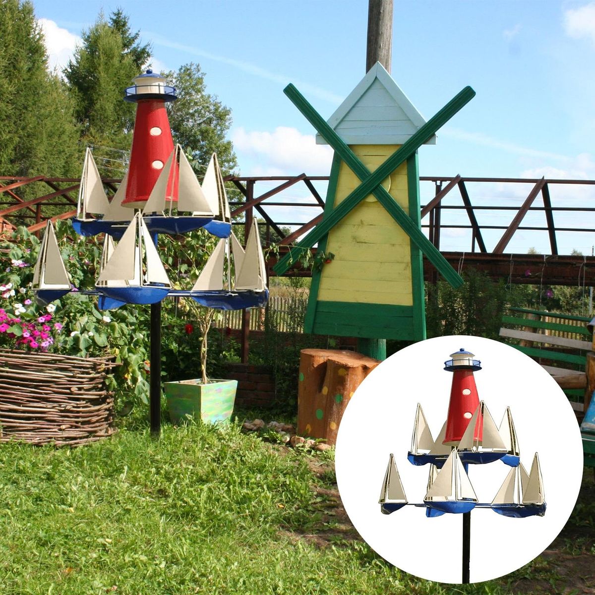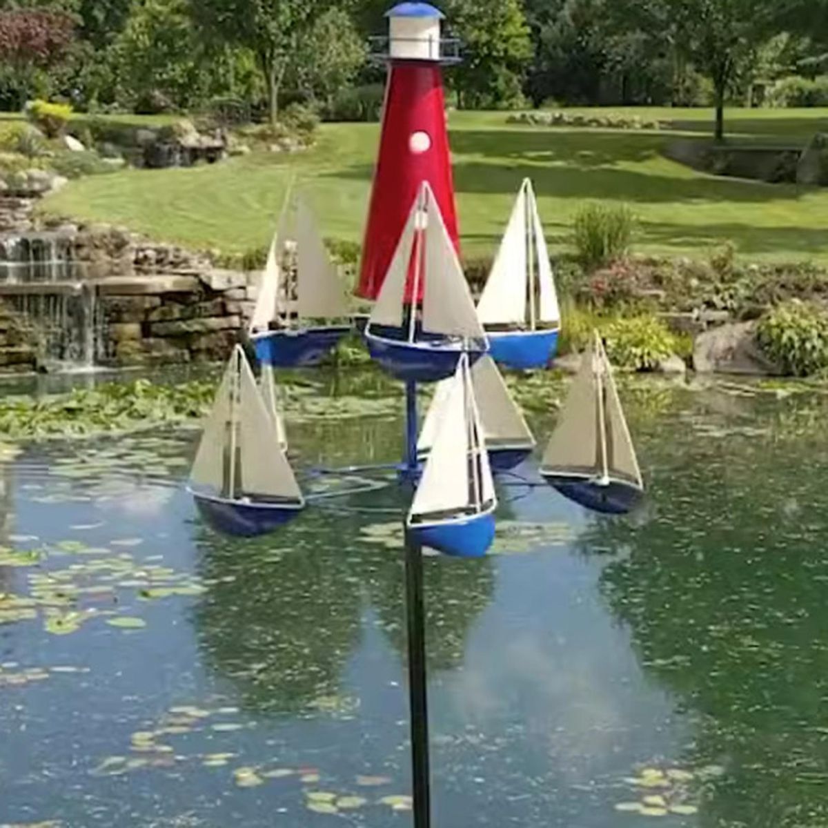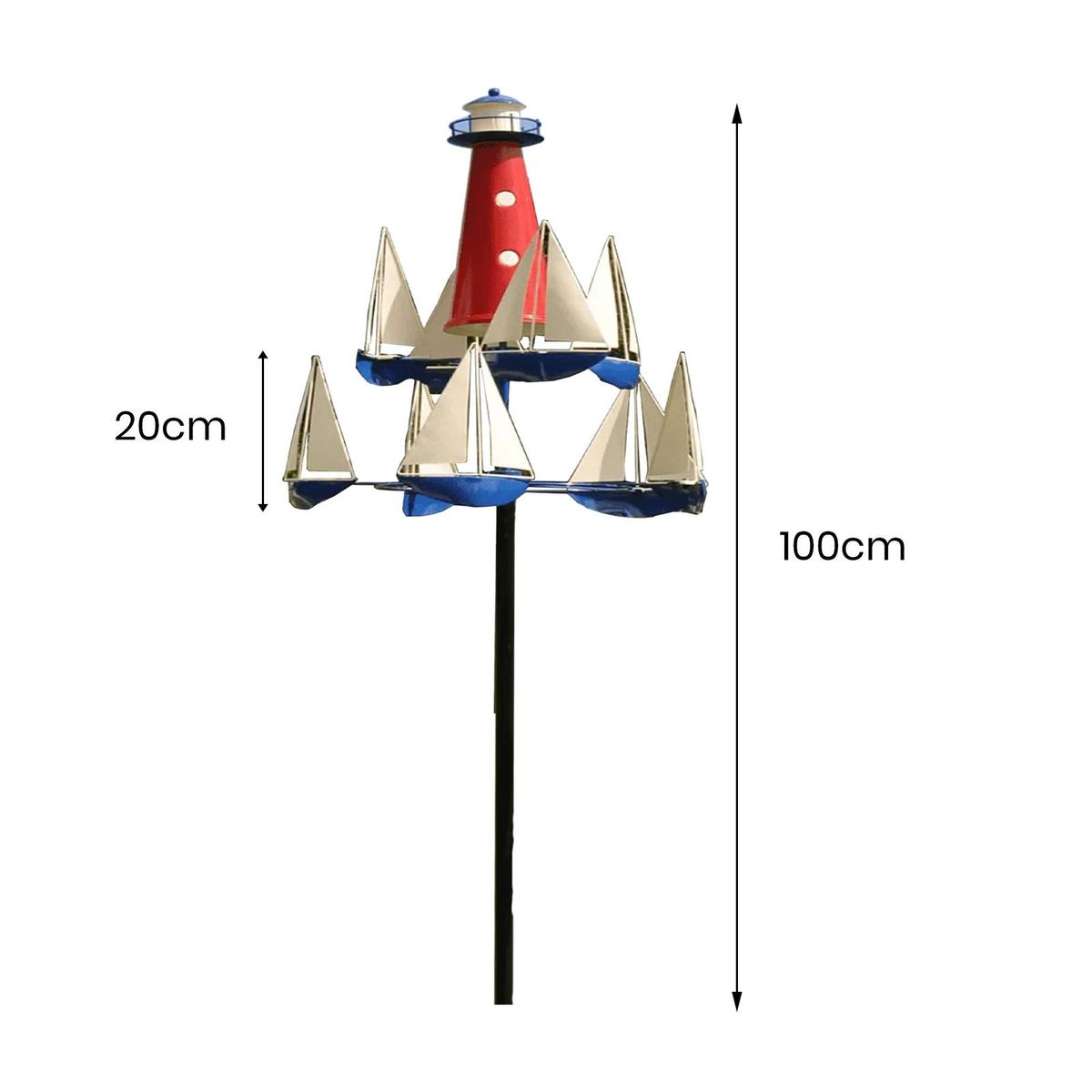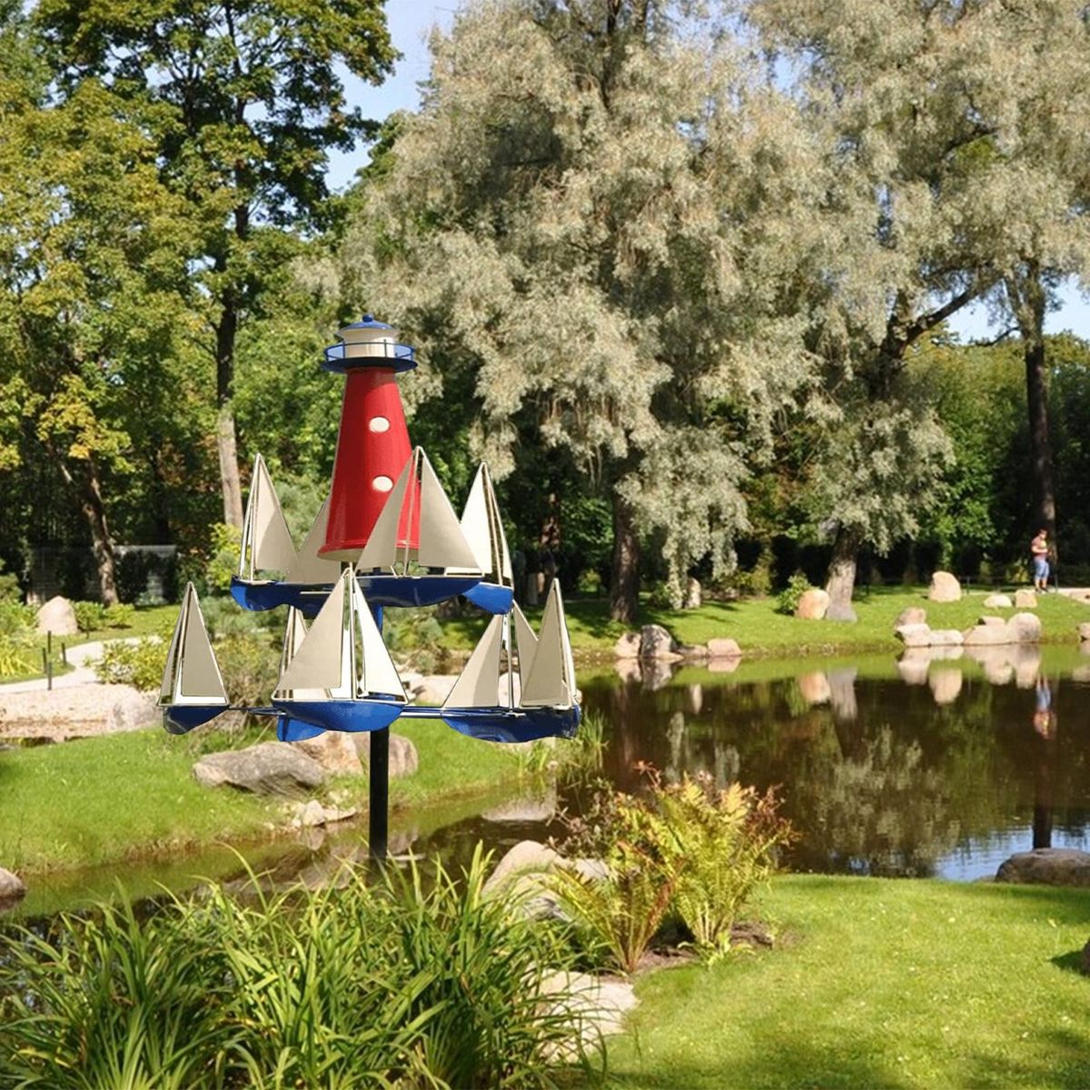 The art wind sculpture, a stunning addition to any outdoor space. this nautical-themed wind sculpture features spinning boats that gracefully move in opposite directions with the winds, anchored by a central lighthouse. crafted to withstand strong winds or a gentle breeze, it brings the serene beauty of the ocean to your garden, yard, or even next to the lake or shore.