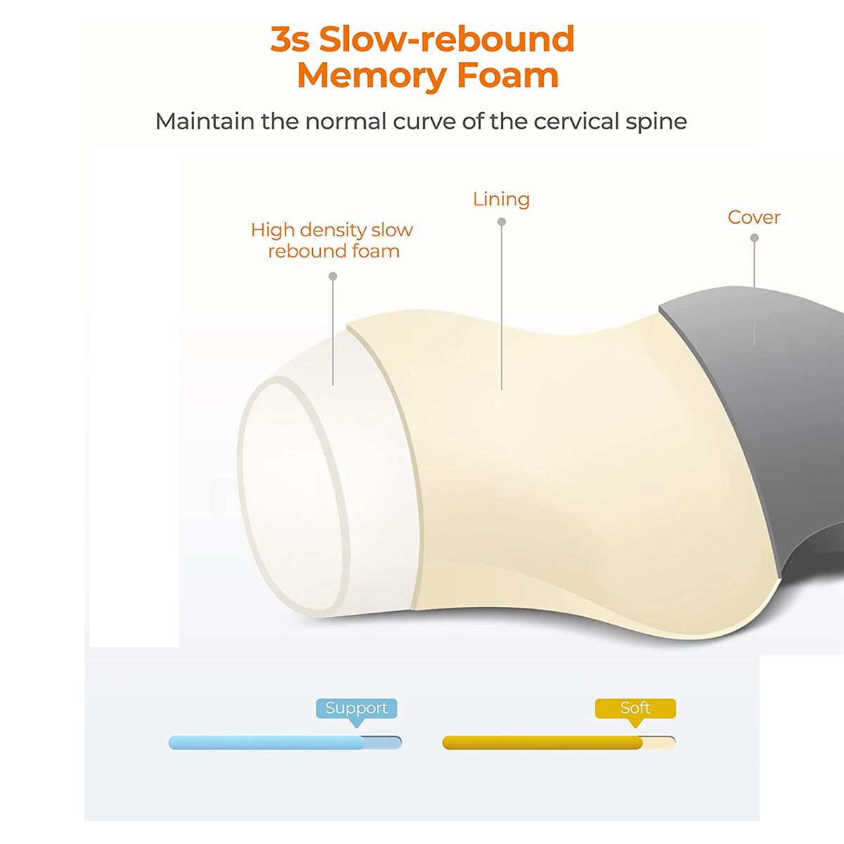 SLOW- MEMORY FOAM: When the slow- memory foam gets in touch with the 's body temperature, the pressure area is evenly distributed to avoid discomfort. The pillow allows you to stretch your muscles at different levels which increases neck and back flexibility and restores a natural posture.