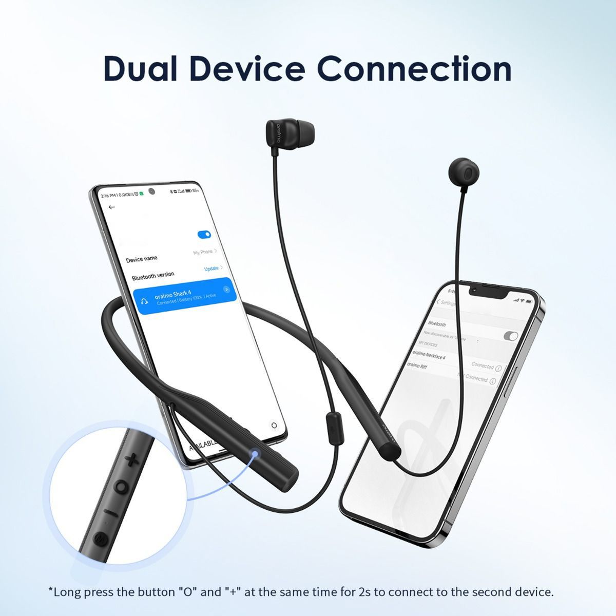 *Long press the button "O" and "+" at the same time for 2s to connect to the second device.