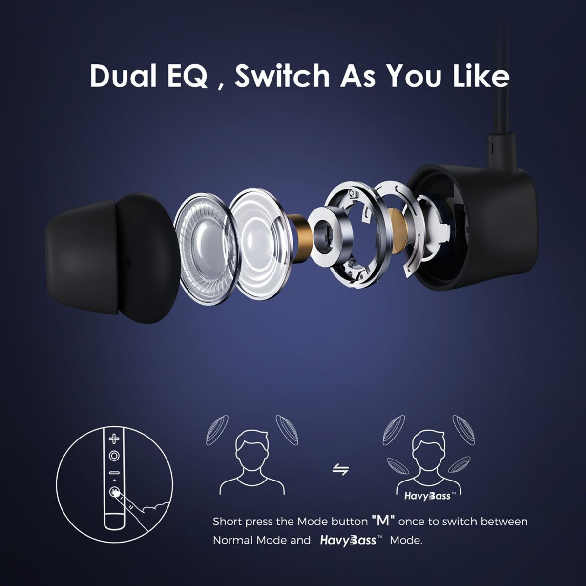 Short press the Mode button "M" once to switch between Normal Mode and HavyBass™ Mode.