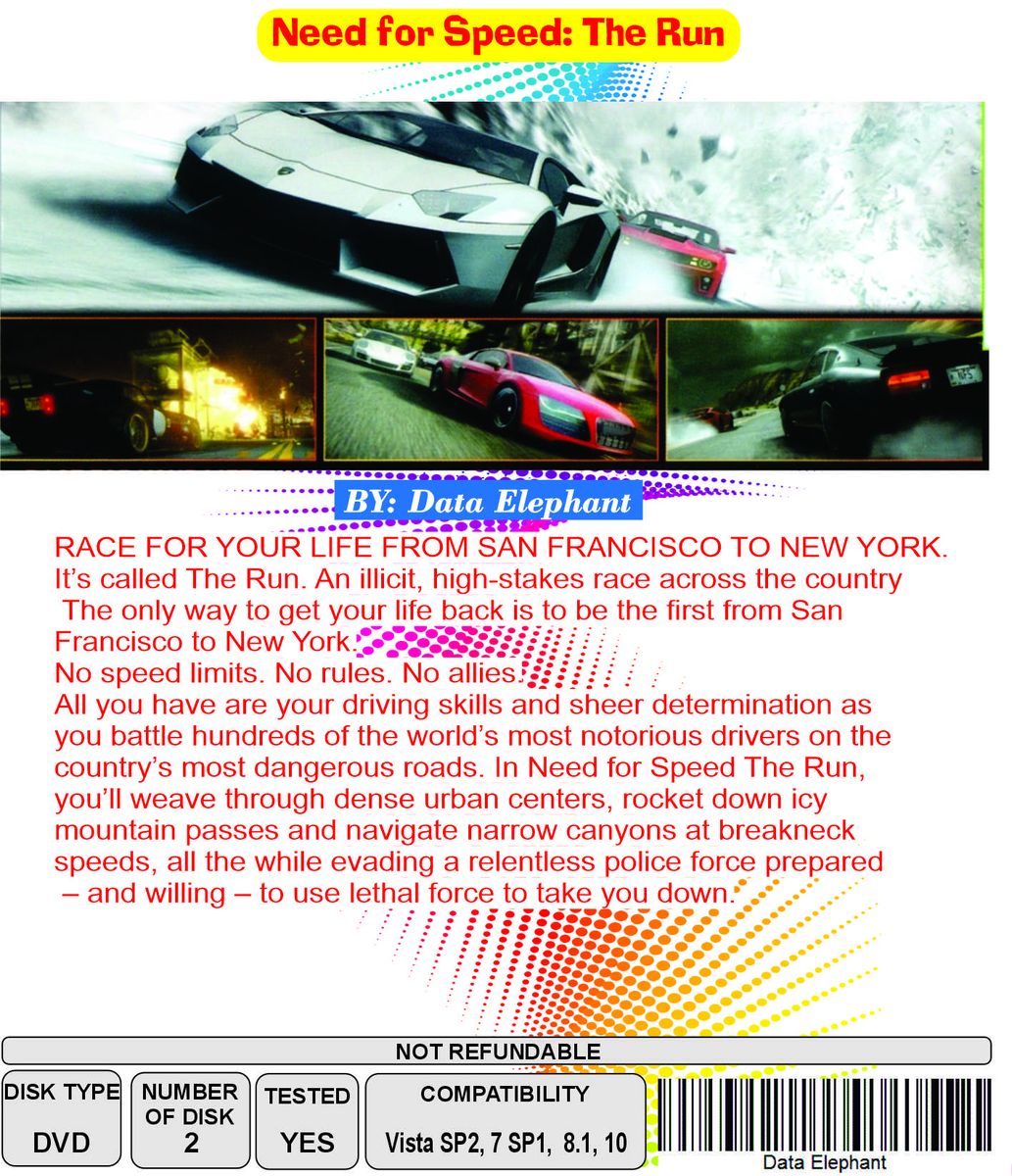Need for Speed: The Run is a 2011 racing video game and the eighteenth title in the Need for Speed series. Published by Electronic Arts, it was released on November 15, 2011, with EA Black Box developed versions for PlayStation 3, Windows, Xbox 360.The game focuses on point-to-point races involving overtaking opponents, defeating rivals, time attacks, and evading the efforts of both police and criminal gang members to stop them.