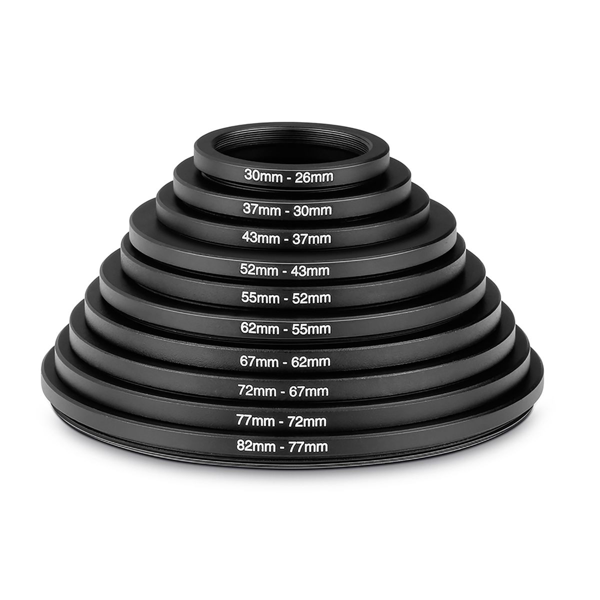 The Step-down Adapter Ring Set includes: 82-77mm, 77-72mm, 72-67mm, 67-62mm, 62-55mm, 55-52mm, 52-43mm, 43-37mm, 37-30mm, 30-26mm.