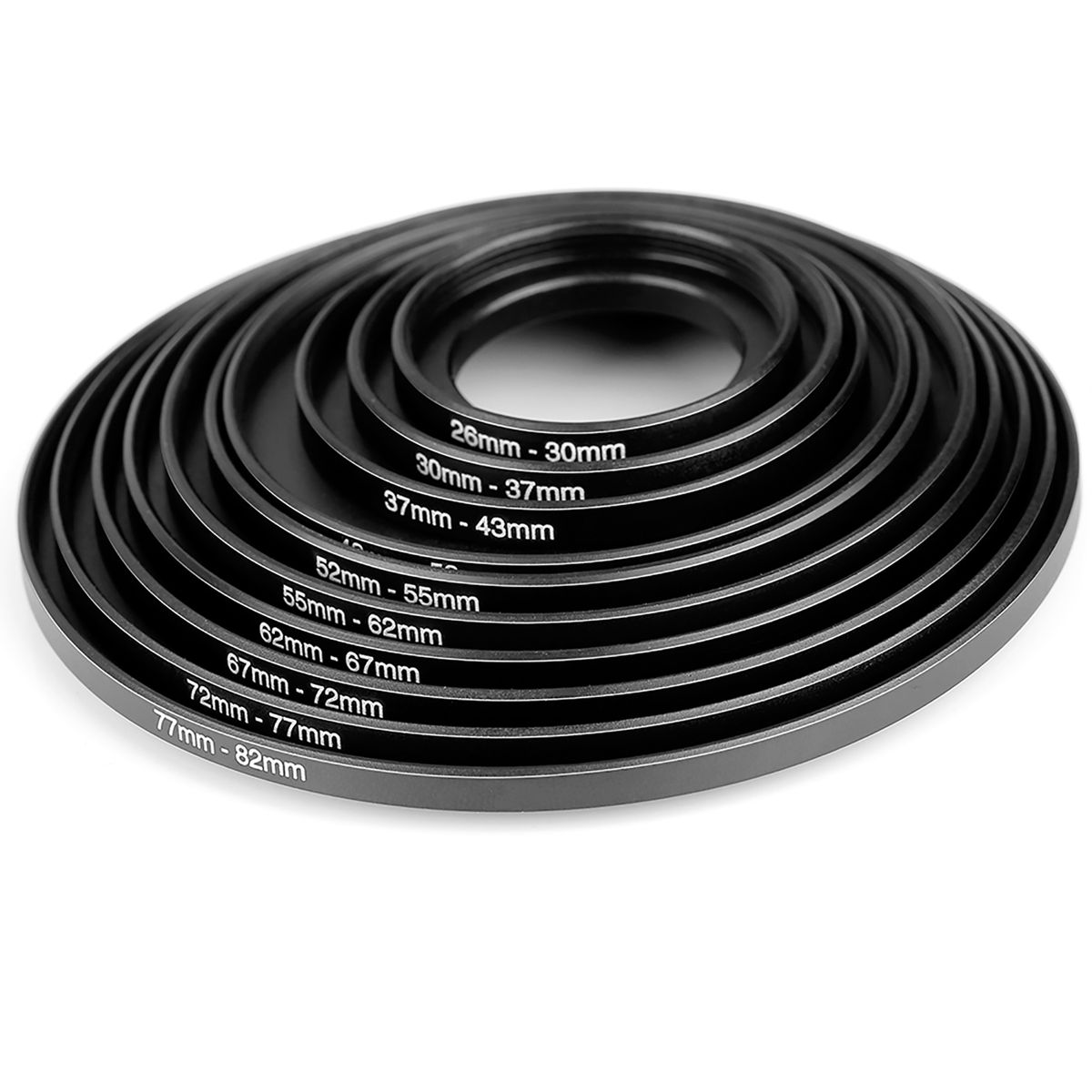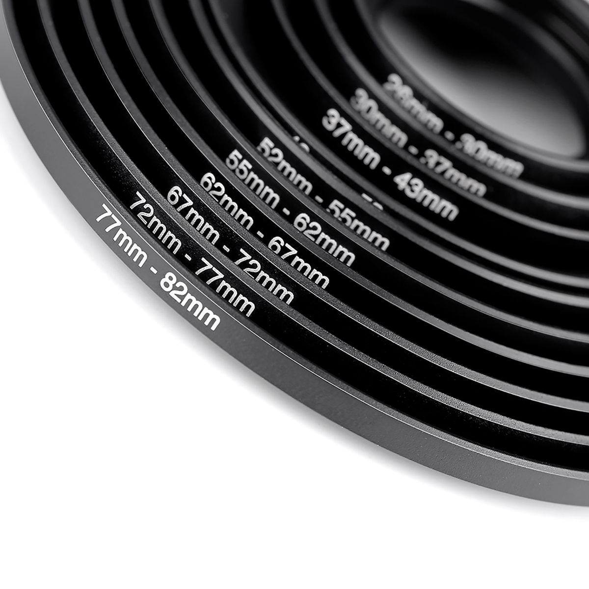 The Step-up Adapter Ring Set includes: 26-30mm, 30-37mm, 37-43mm, 43-52mm, 52-55mm, 55-62mm, 62-67mm, 67-72mm, 72-77mm, 77-82mm.