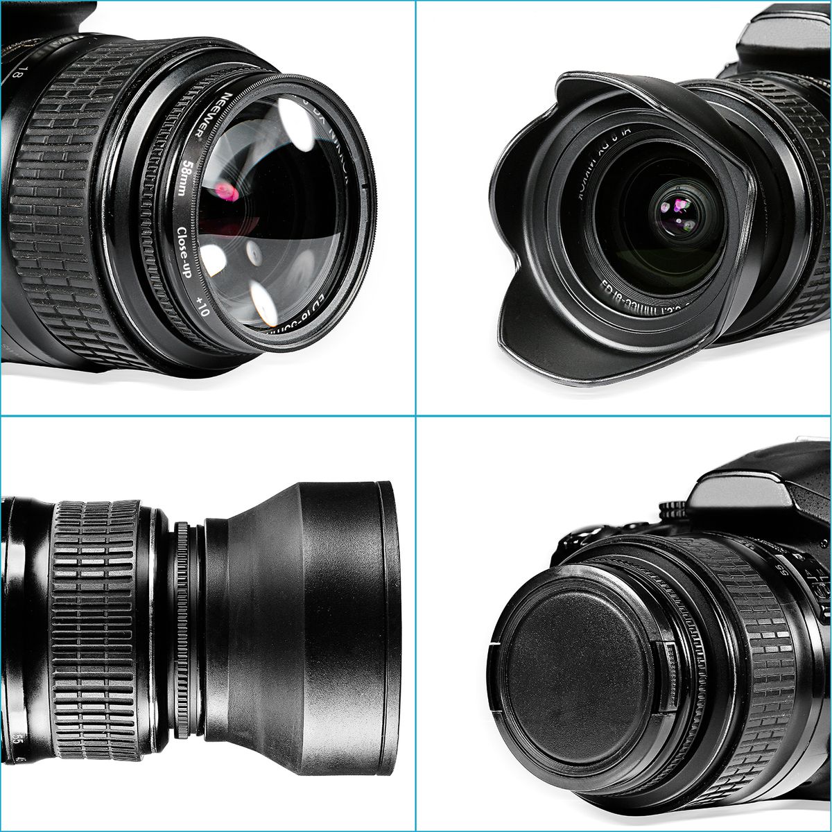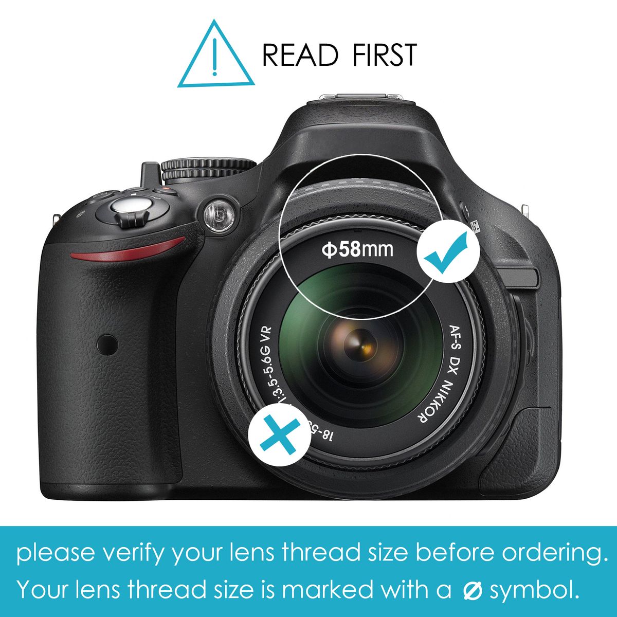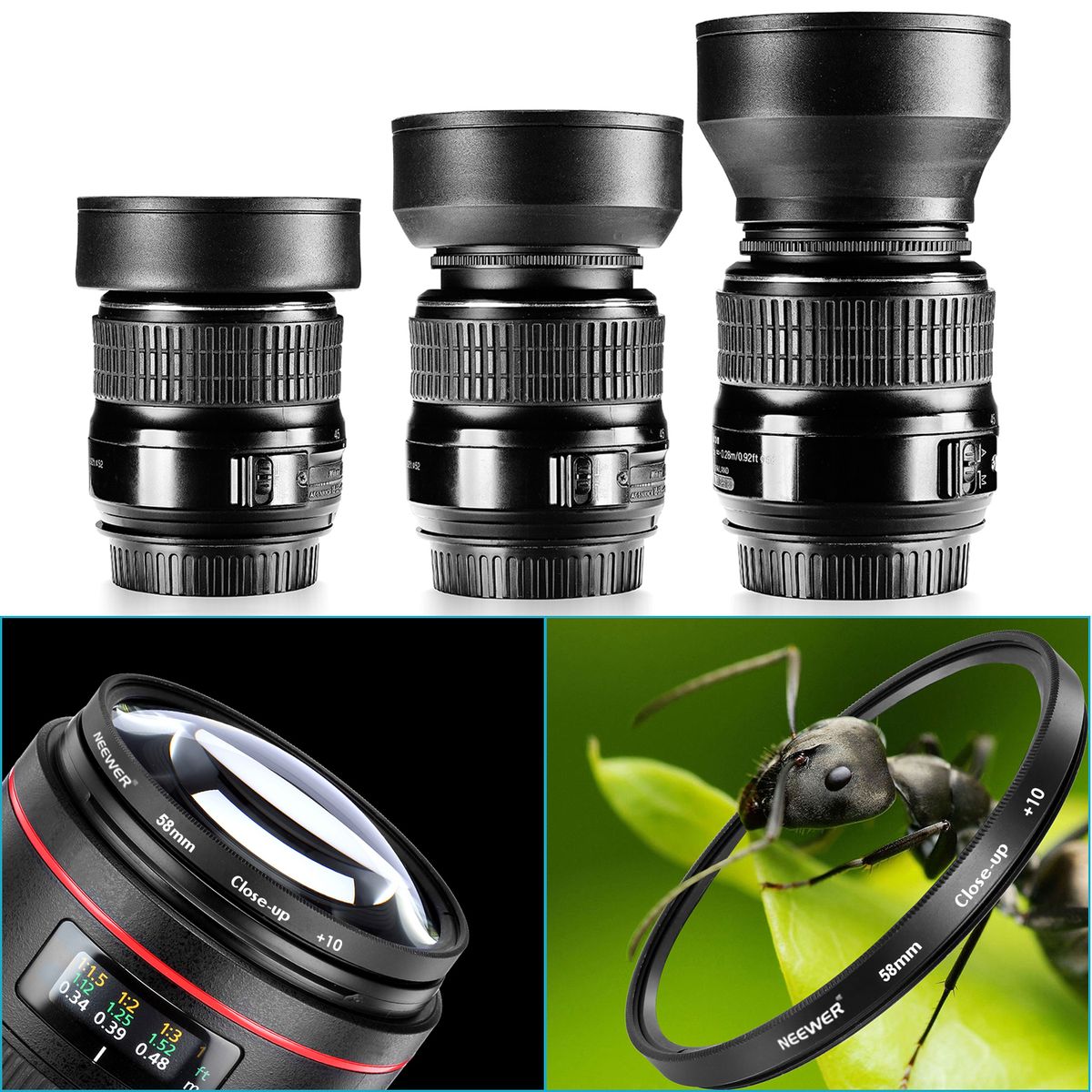 The 58mm filter kit(UV, CPL, FLD)fit any camera lens with a 58mm filter thread. High quality metal and glass construction. The 58mm macro close-up filter set(+1, +2, +4, +10)are double threaded allowing additional filters, lenses, or attachments to be mounted on top. The ND filters(ND2, ND4, ND8) reduce the amount of light reaching the film without affecting the color.