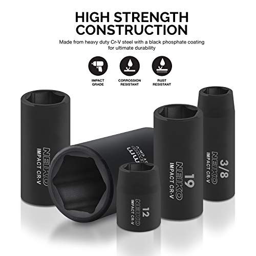 Details: Neiko 02440A 3/8" Drive Impat Soket Set, 44 Piee Deep and Shallow Assortment Standard SAE and Metri Sizes (5/16-Inh to 3/4-Inh and 8-19 mm) Cr-V SteelSAE Sizes Deep: 5/16, 3/8, 7/16, 1/2, 9/16, 5/8, 11/16, 3/4 (inhes) Standard: 5/16, 3/8, 7/16, 1/2, 9/16, 5/8, 11/16, 3/4 (inhes) Metri Sizes Deep: 8, 9, 10, 11, 12, 13, 14, 15, 16, 17, 18, 19 (millimeter) Standard: 8, 9, 10, 11, 12, 13, 14, 15, 16, 17, 18, 19 (millimeter) Aessories 2 x 3/8" Drive Impat Extension Bars, 3" and 6" 3/8-inh Drive Impat Universal Joint 1/2" to 3/8" Drive Impat RedueNeiko 30249A Impat Adapter and Reduer Set, Chrome Vanadium Steel 5-Piee Set for Impat Driver ConversionsDurable 5-piee impat soket adapter and reduer set. Heavy duty hrome vanadium steel onstrution is designed for use with impat drivers and wrenhes. A blak oxide finish makes eah piee orrosion resistant and very durable. Spring loaded ball detents keep your sokets seure. Inludes a full range of sizes to aommodate any soket or wrenh ombination. 5 Piee Set Inludes 2 Reduers: 3/8" Female x 1/4" Male, 1/2" (F) x 3/8" (M) and 3 Adaptors: 1/4" (F) x 3/8" (M), 3/8" (F) x 1/2" (M), 1/2" (F) x 3/4" (M).