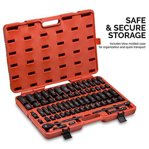 - The omplete set omes with the following piees: 58 x 1/2" drive sokets - SAE (Deep and Shallow): 3/8, 7/16, 1/2, 9/16, 5/8, 11/16, 3/4, 13/16, 7/8, 15/16, 1, 1-1/16, 1-1/8, 1-1/4", Metri (Deep and Shallow): 10, 11, 12, 13, 14, 15, 17, 18, 19, 21, , 24mm; 3 x 1/2" extension bars: 3, 5, 10-inh, 1 x 1/2" by 10-inh length quik-release rathet handle -tooth, 1 x 1/2" impat universal joint, 1 x 1/2" (F) to 3/8" (M) reduer, 1 x 3/8" (F) to 1/2" (M) adapter