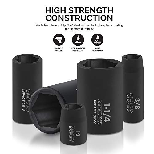 Details: The Neiko 02448A 1/2-inh drive impat soket Master set omes with the following piees: (58) 1/2-inh drive sokets: SAE (deep and shallow): 3/8, 7/16, 1/2, 9/16, 5/8, 11/16, 3/4, 13/16, 7/8, 15/16, 1-inh, 1-1/16-inh, 1-1/8-inh, 1-1/4-inh metri (deep and shallow): 10, 11, 12, 13, 14, 15, 16, 17, 18, 19, 20, 21, , 23, 24mm (3) 1/2-inh drive extension bars: 3, 5, 10-inh, (1) 1/2-inh drive by 10-inh length quik-release rathet handle -tooth (1) 1/2-inh drive impat Universal joint (1) 1/2 (F) to 3/8-inh (M) drive impat Reduer (1) 3/8 (F) to 1/2-inh (M) drive impat Adapter